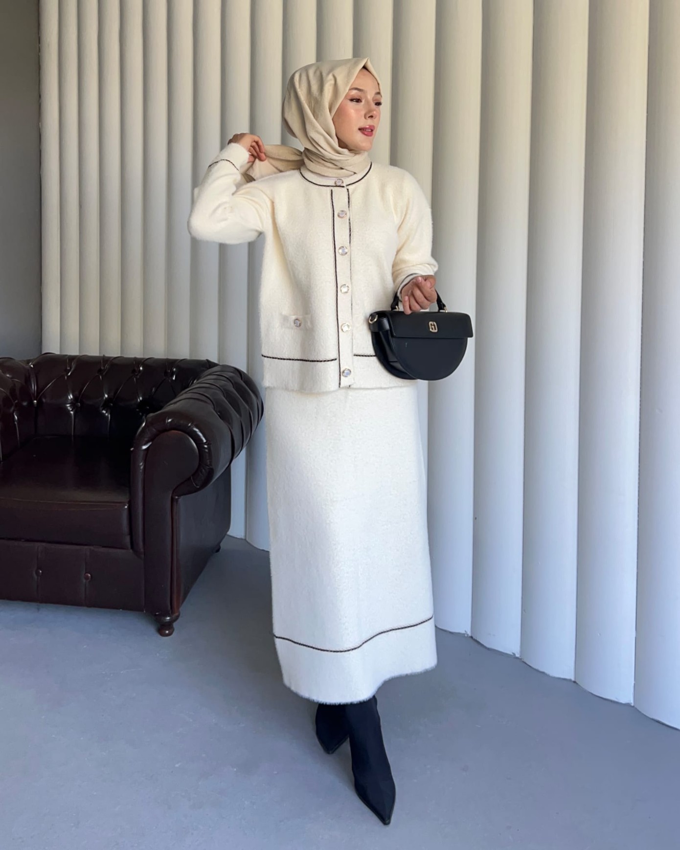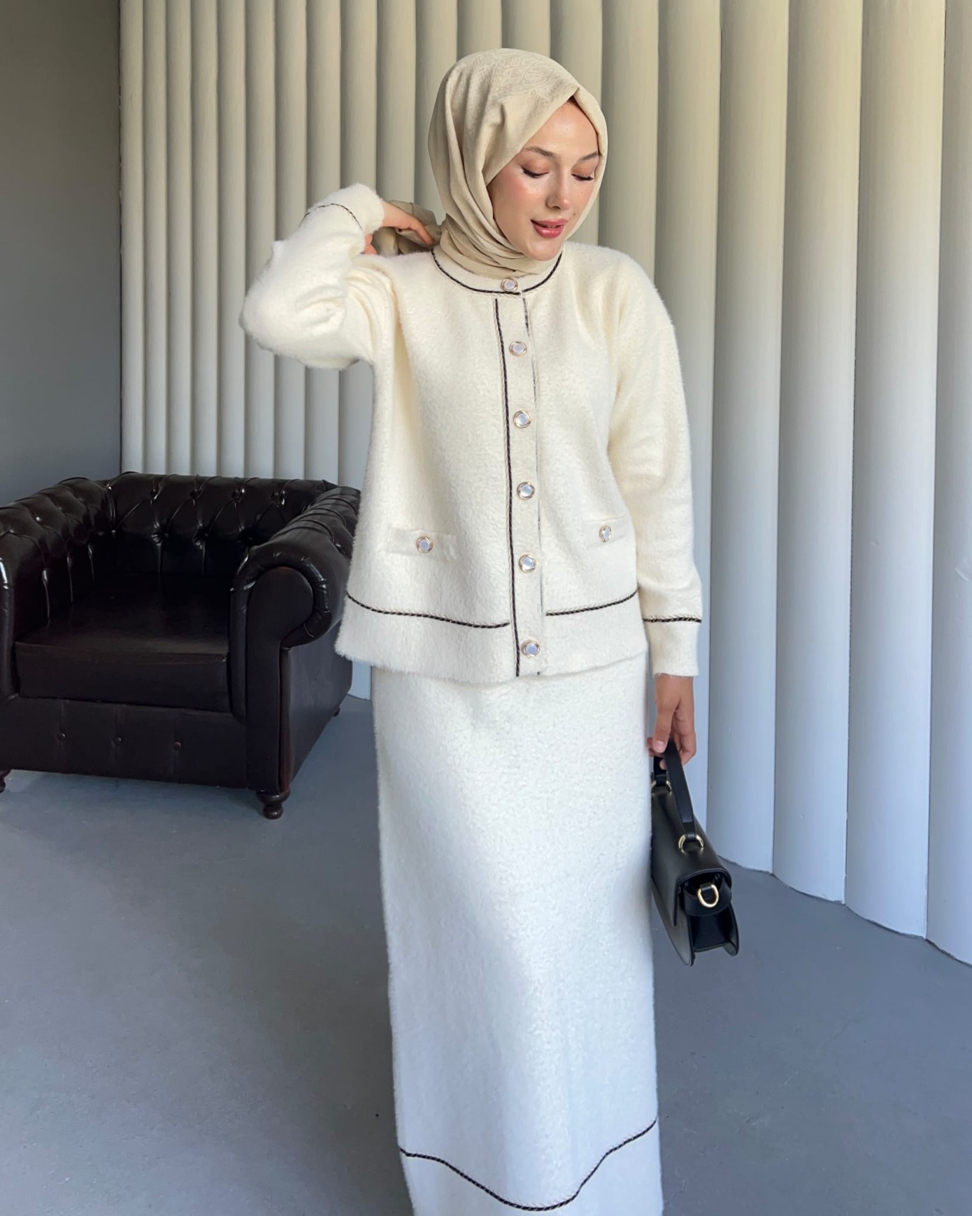 Düğmeli Şerit Detaylı Sakallı Yumoş Takım -Ekru-Ekru