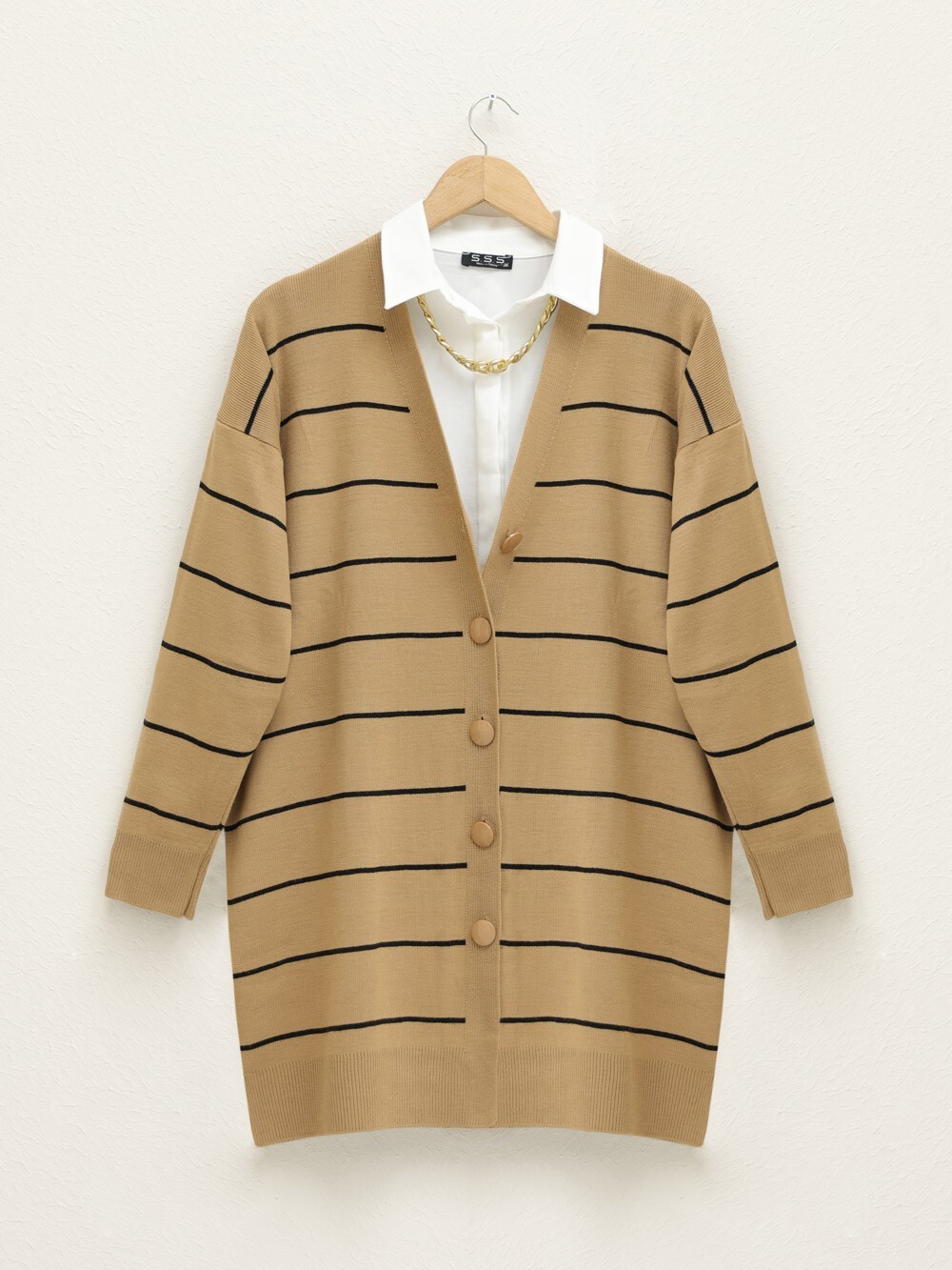 Düğmeli Uzun Triko Hırka -Vizon-Vizon