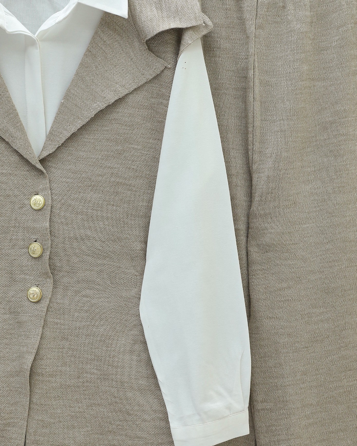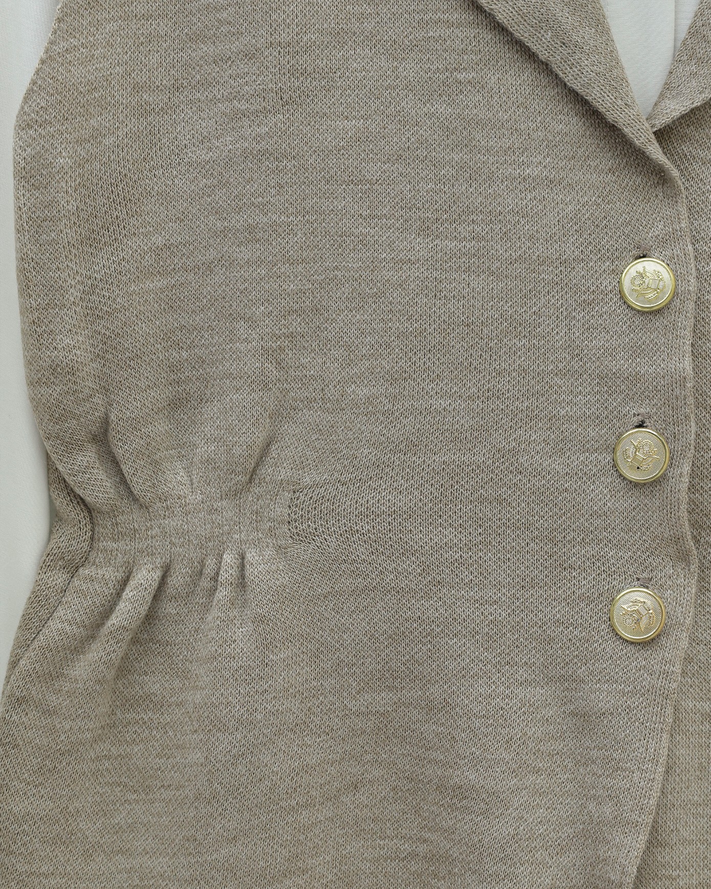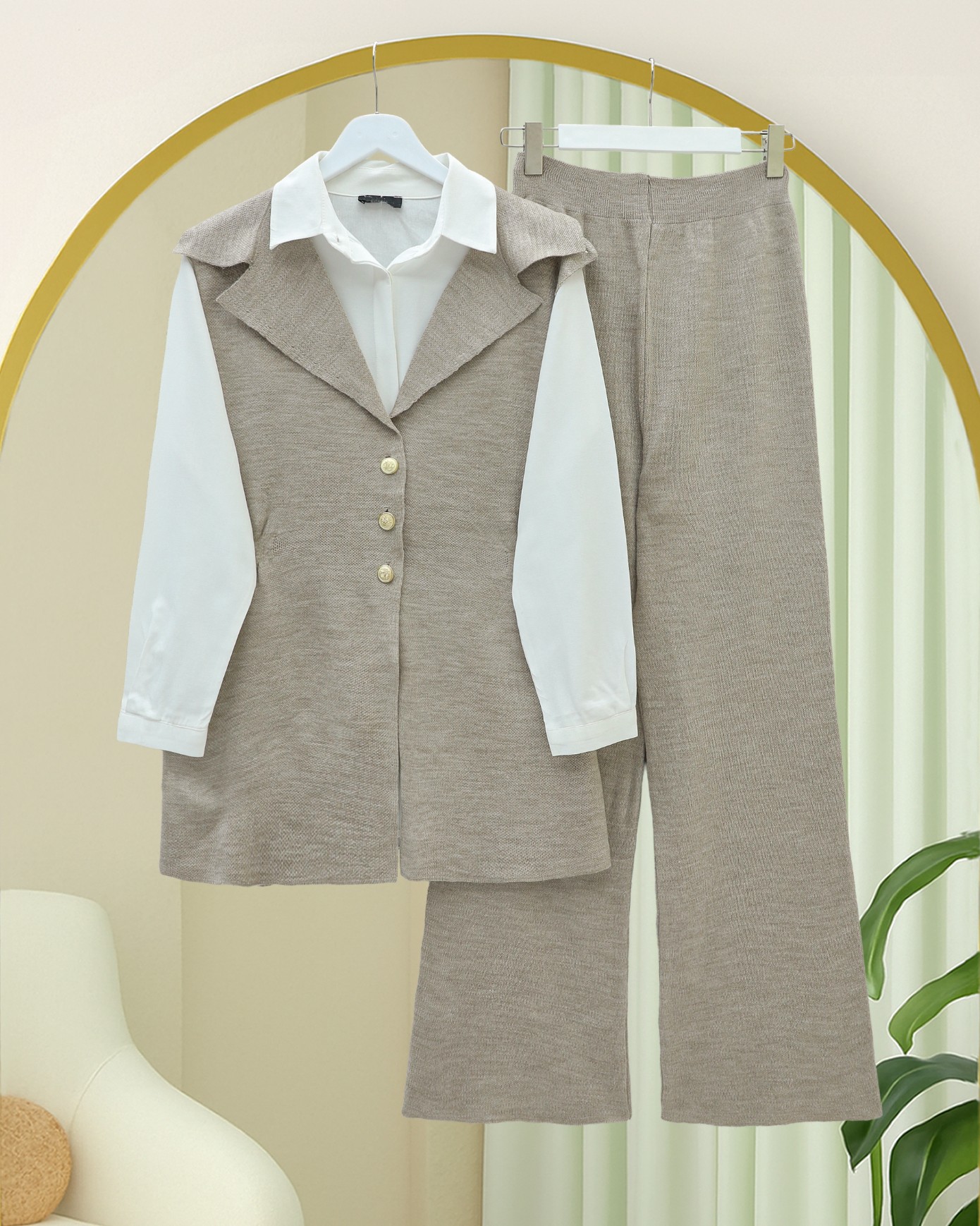 Düğmeli V Yaka Yelek Pantolon Triko Takım -Açık Vizon-Açık Vizon