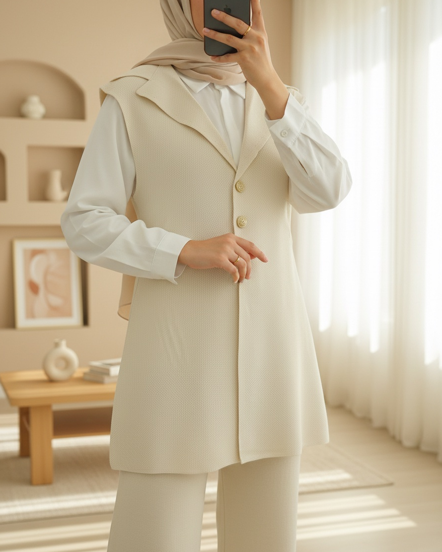 Düğmeli V Yaka Yelek Pantolon Triko Takım -Krem-Krem