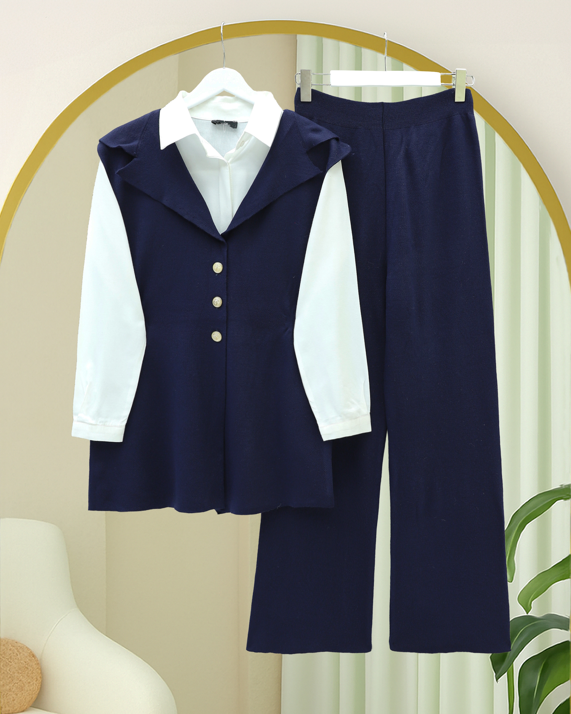 Düğmeli V Yaka Yelek Pantolon Triko Takım -Laci-Lacivert