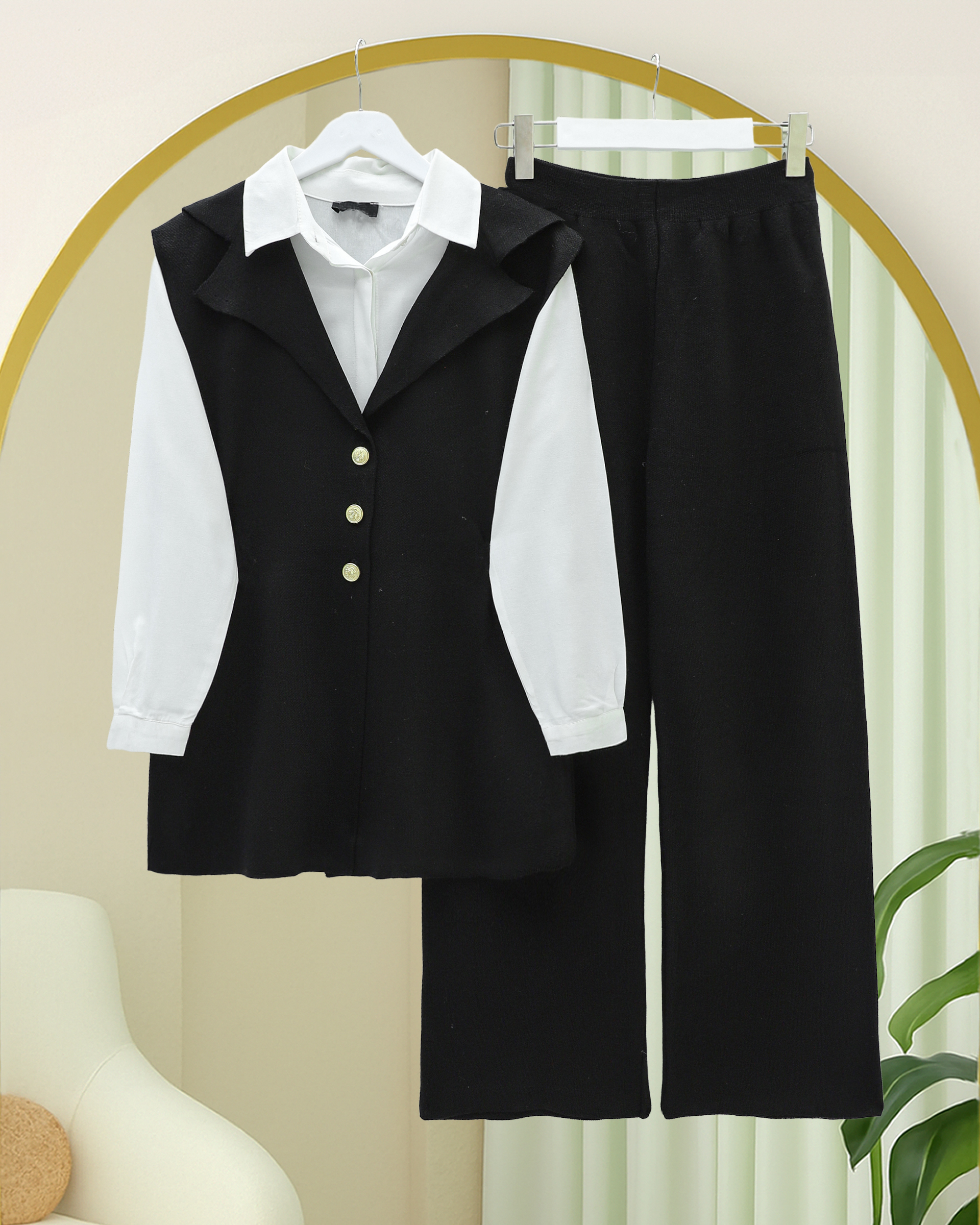 Düğmeli V Yaka Yelek Pantolon Triko Takım -Siyah-siyah