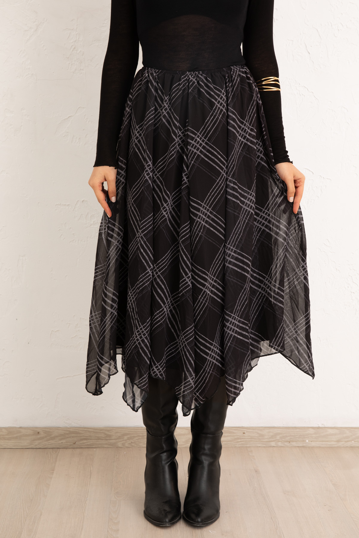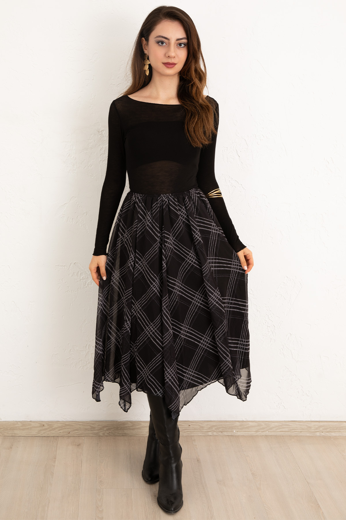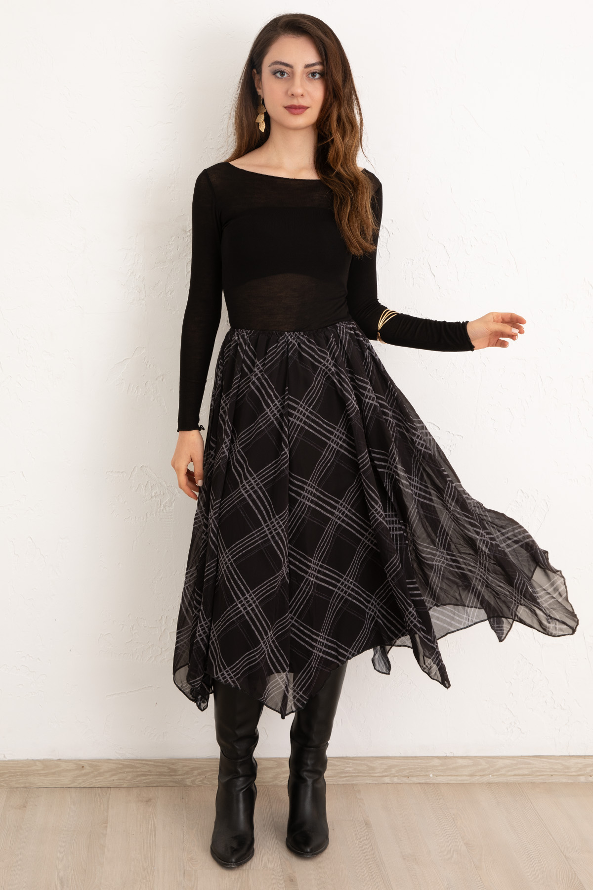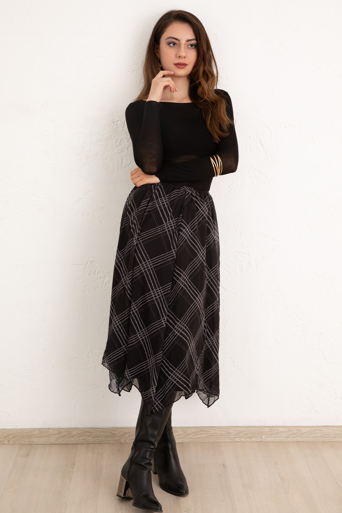 Ekose Desenli Asimetrik Etek 4141 - SİYAH-Siyah