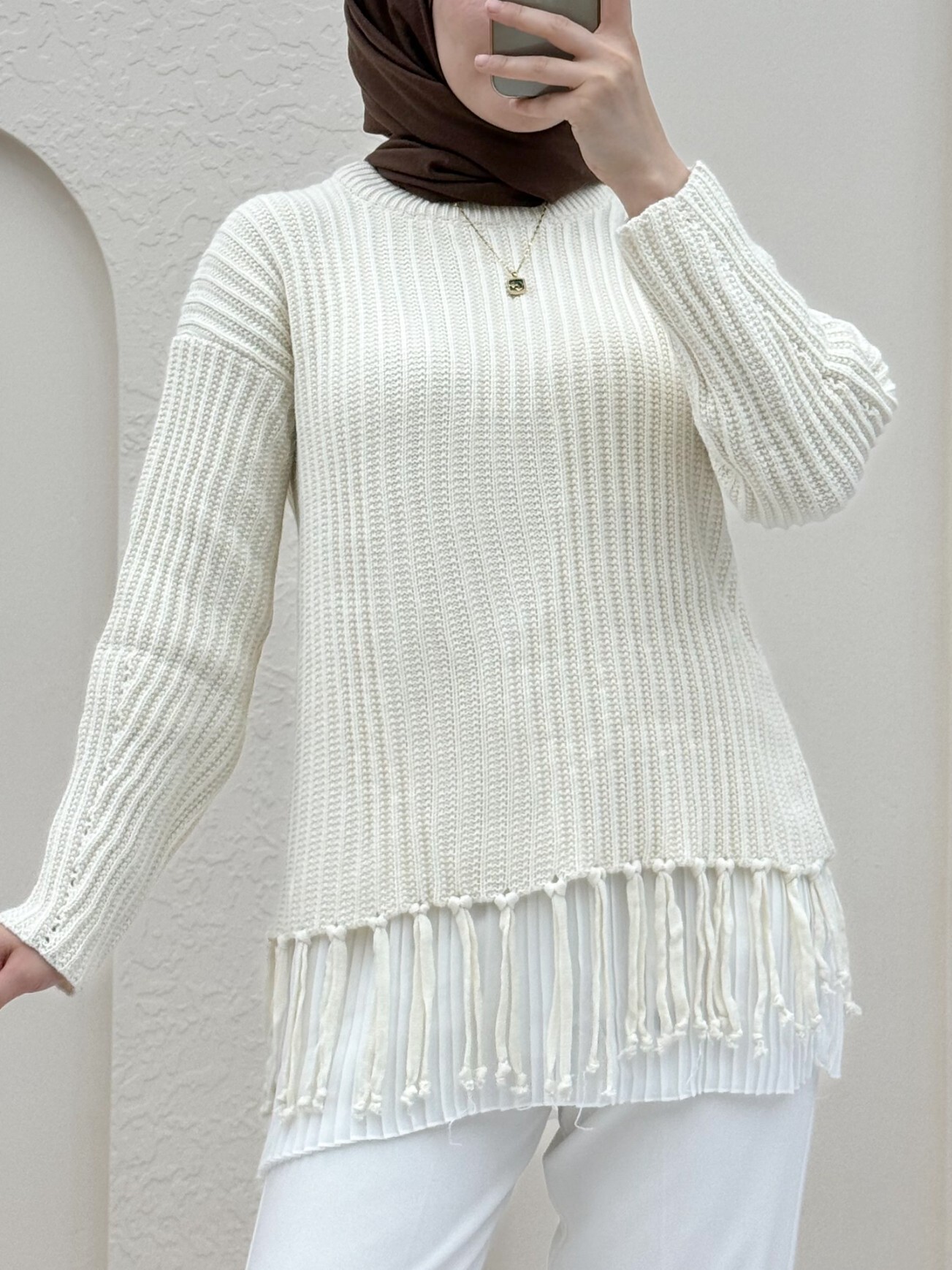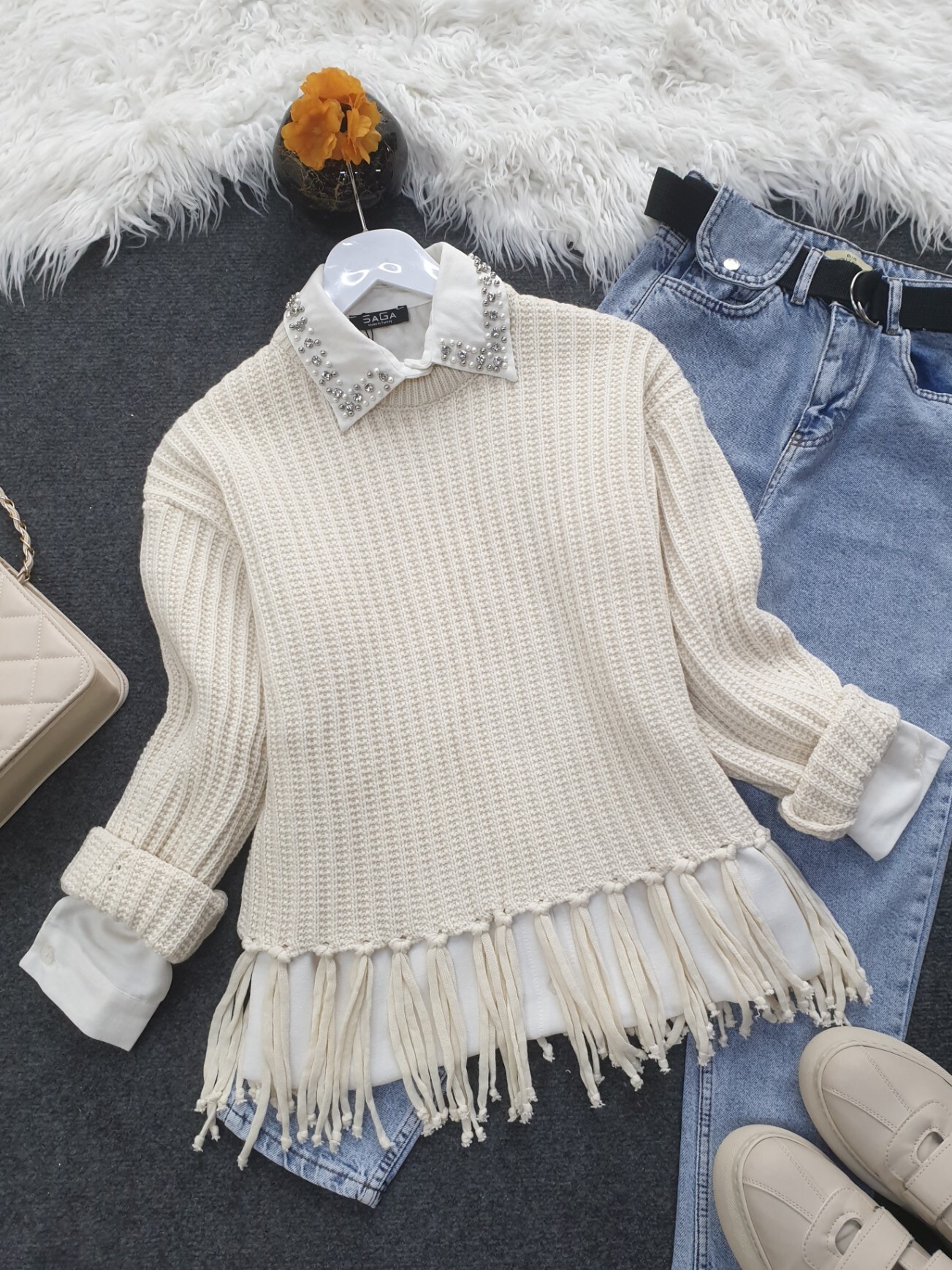 Eteği Püsküllü Kalın Örgü Kısa Kazak -Taş-Taş