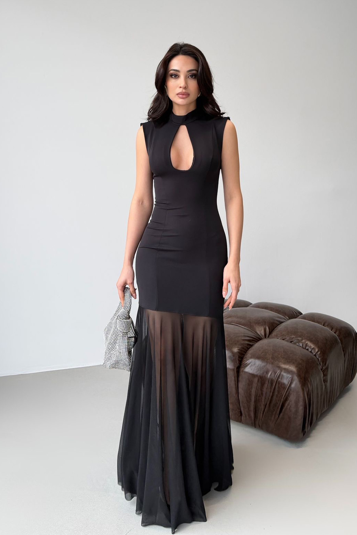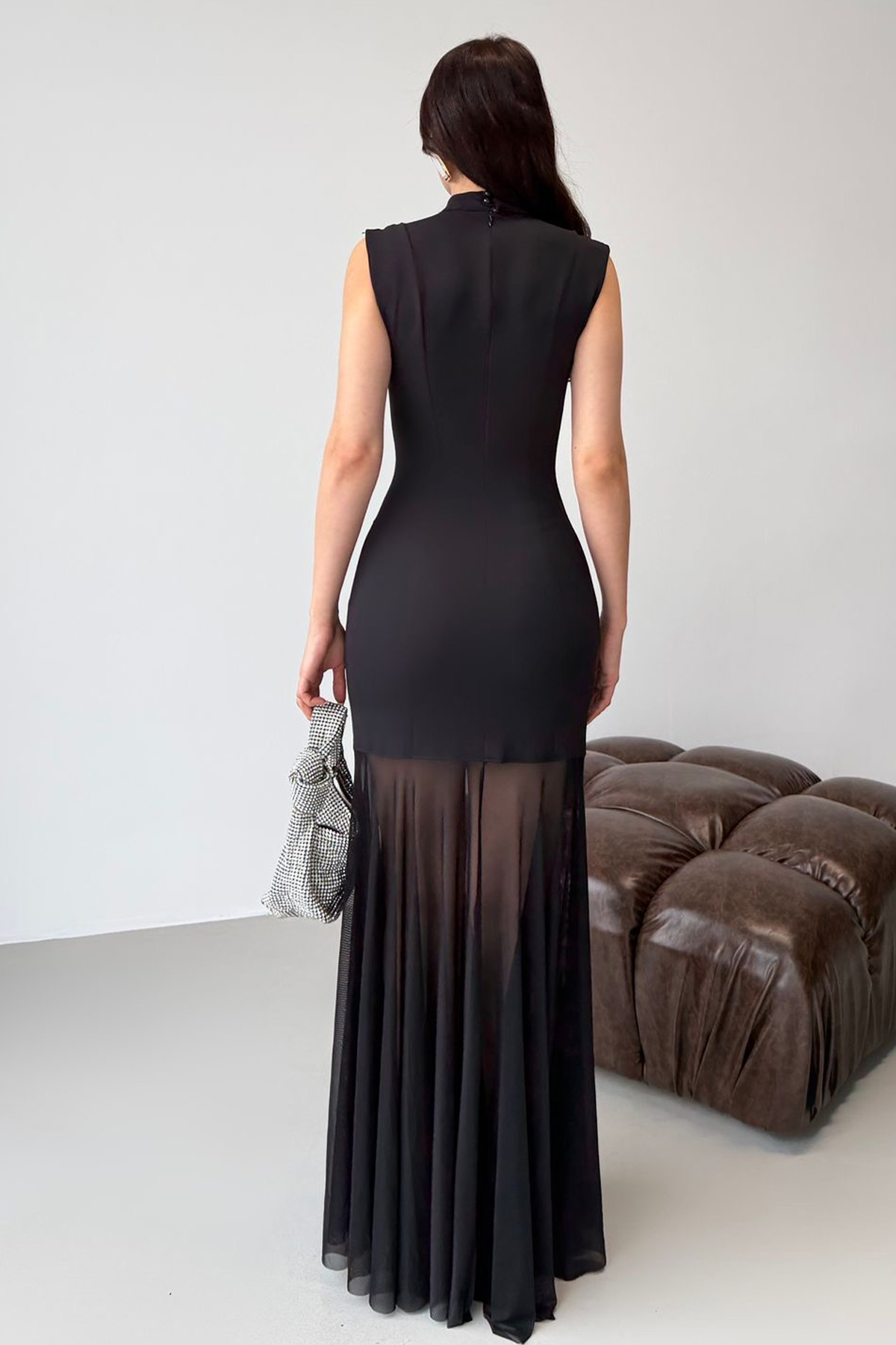 Eteği Tüllü Dökümlü Maxi Elbise 2776 - SİYAH-Siyah