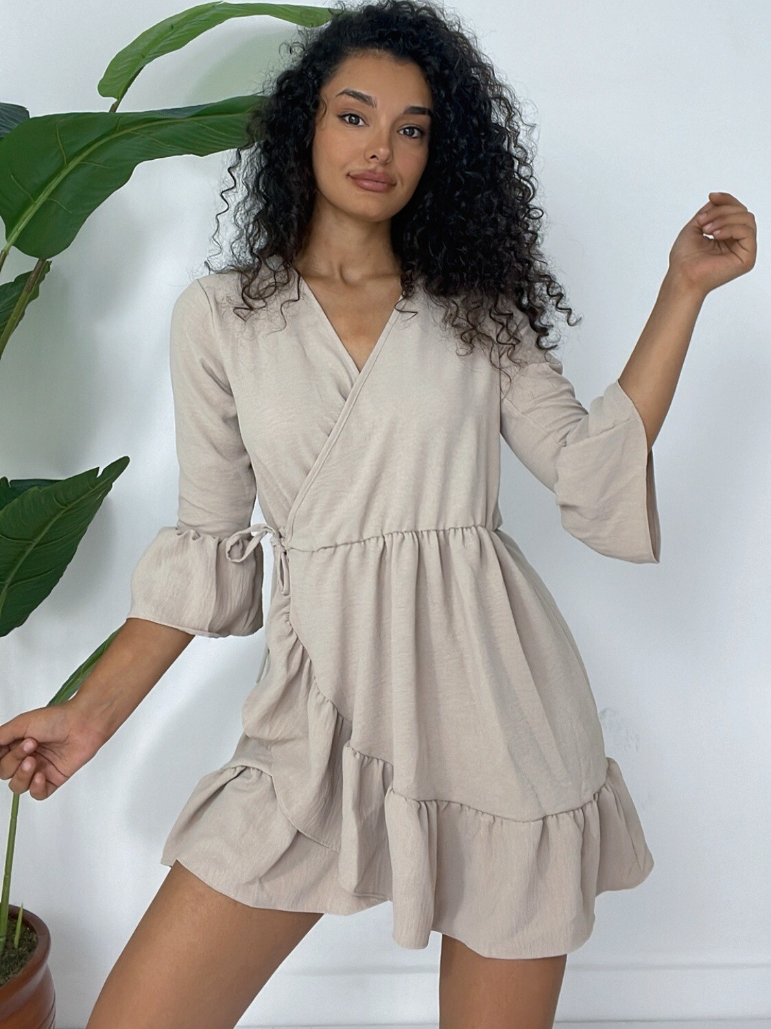 Eteği Ve Kolları Fırfırlı Beli Lastikli Ayrobin Elbise -Açık Vizon-Açık Vizon