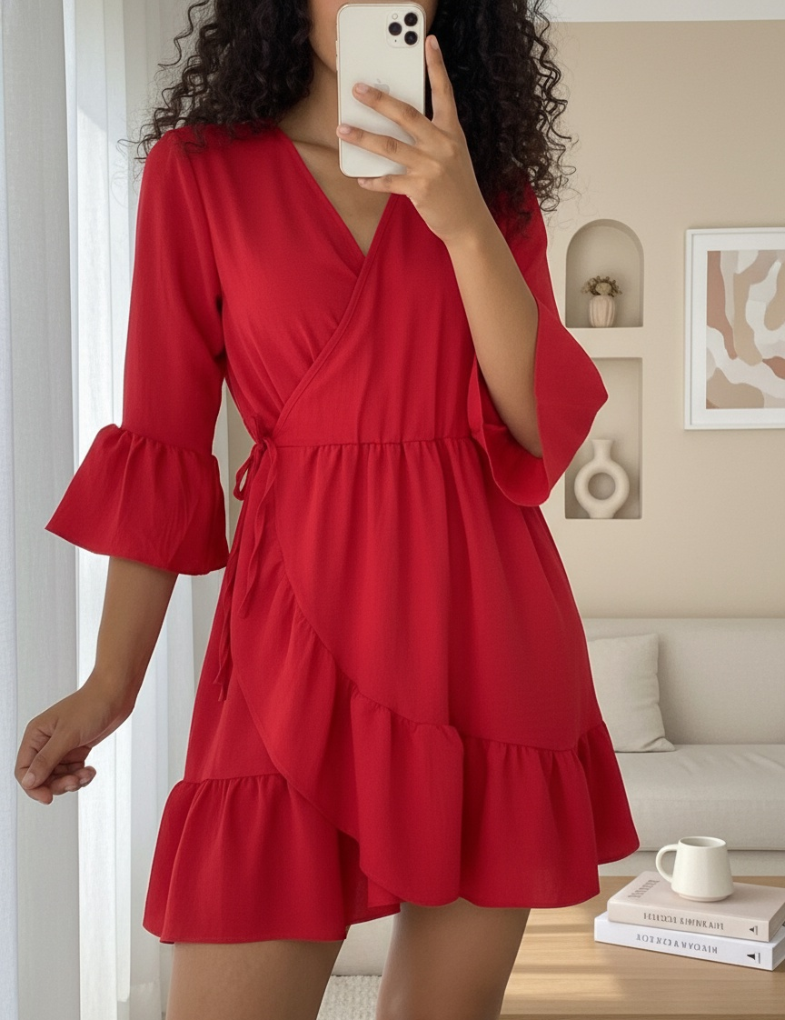 Eteği Ve Kolları Fırfırlı Beli Lastikli Ayrobin Elbise -Kırmızı-Kırmızı