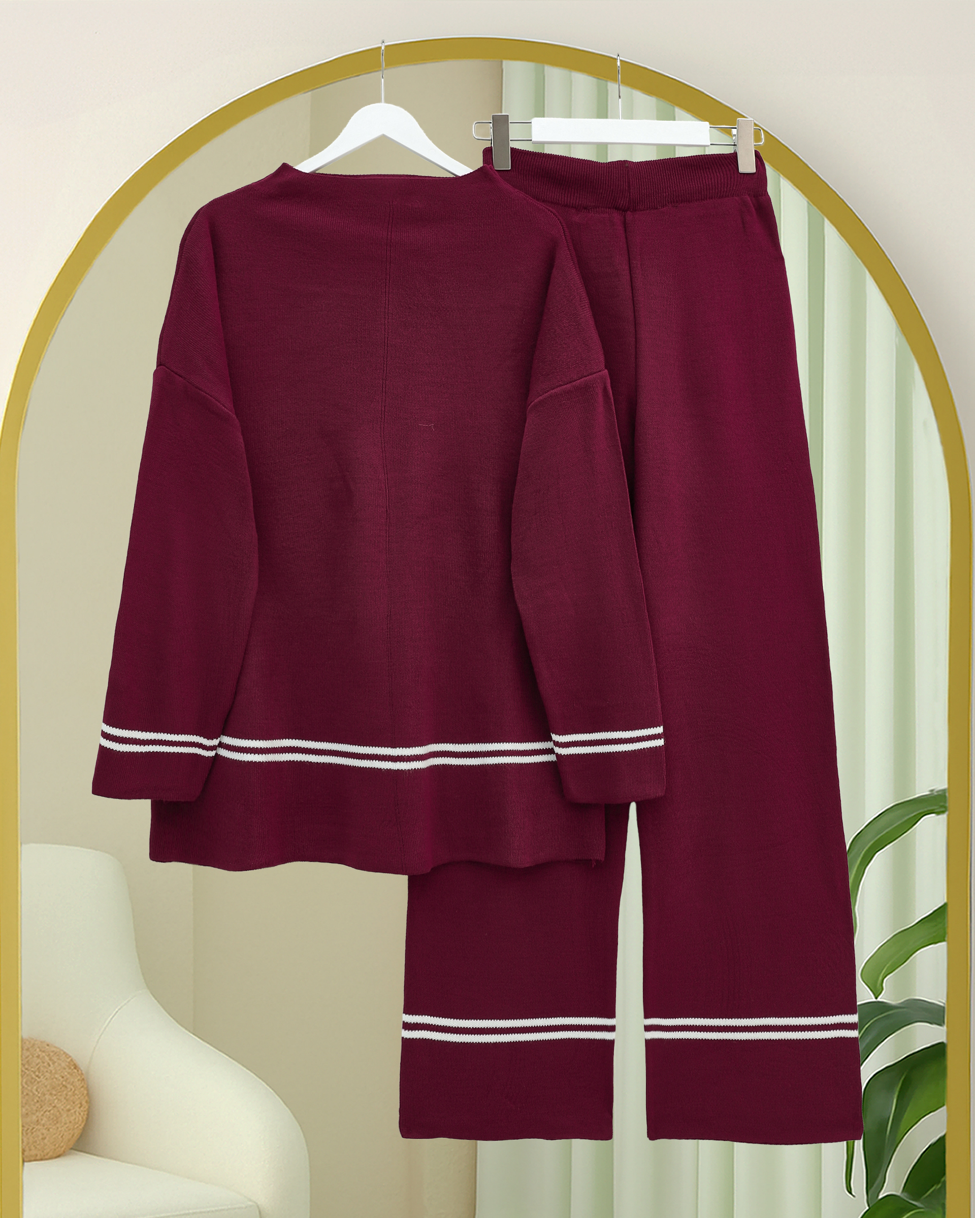 Eteği Ve Kolu Çizgili Triko Takım -Bordo-Bordo