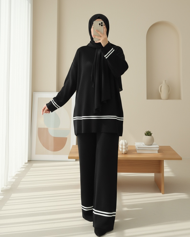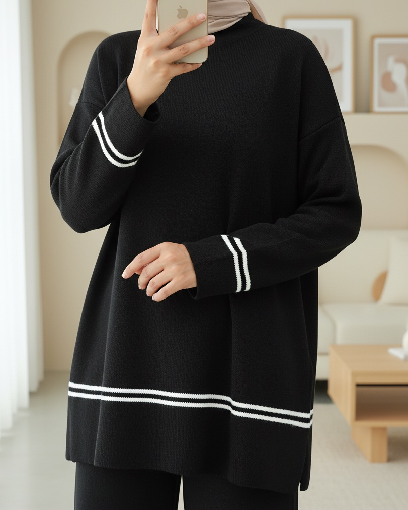 Eteği Ve Kolu Çizgili Triko Takım -Siyah-siyah