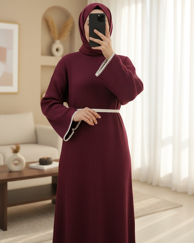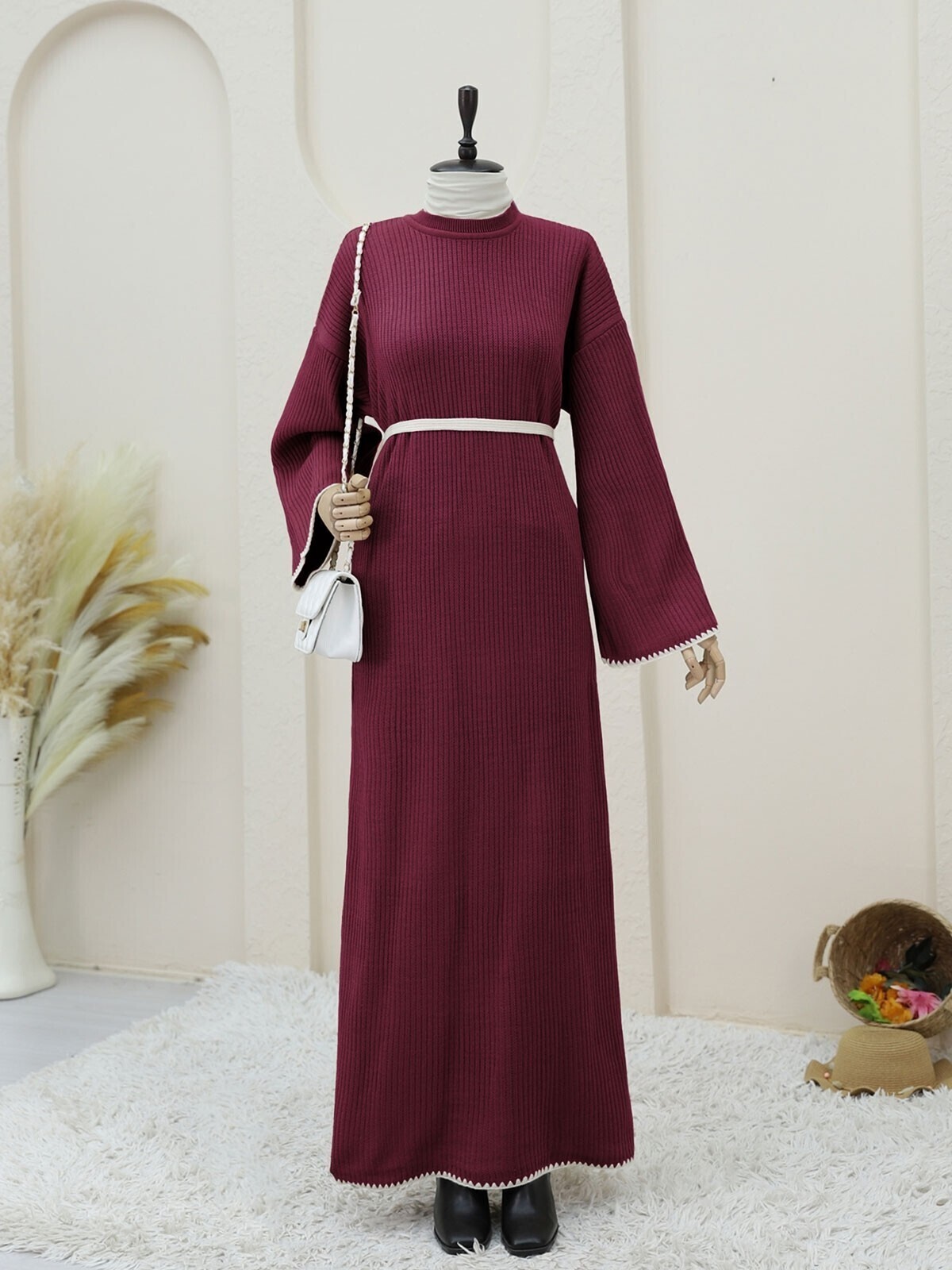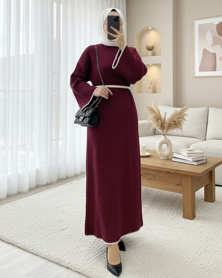 Etek Ucu ve Kolları Nakışlı Bağcıklı Triko Elbise -Bordo-Bordo