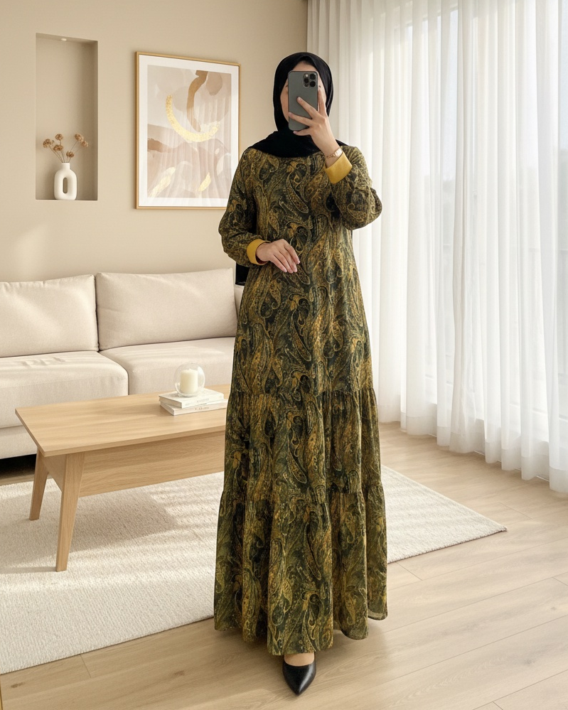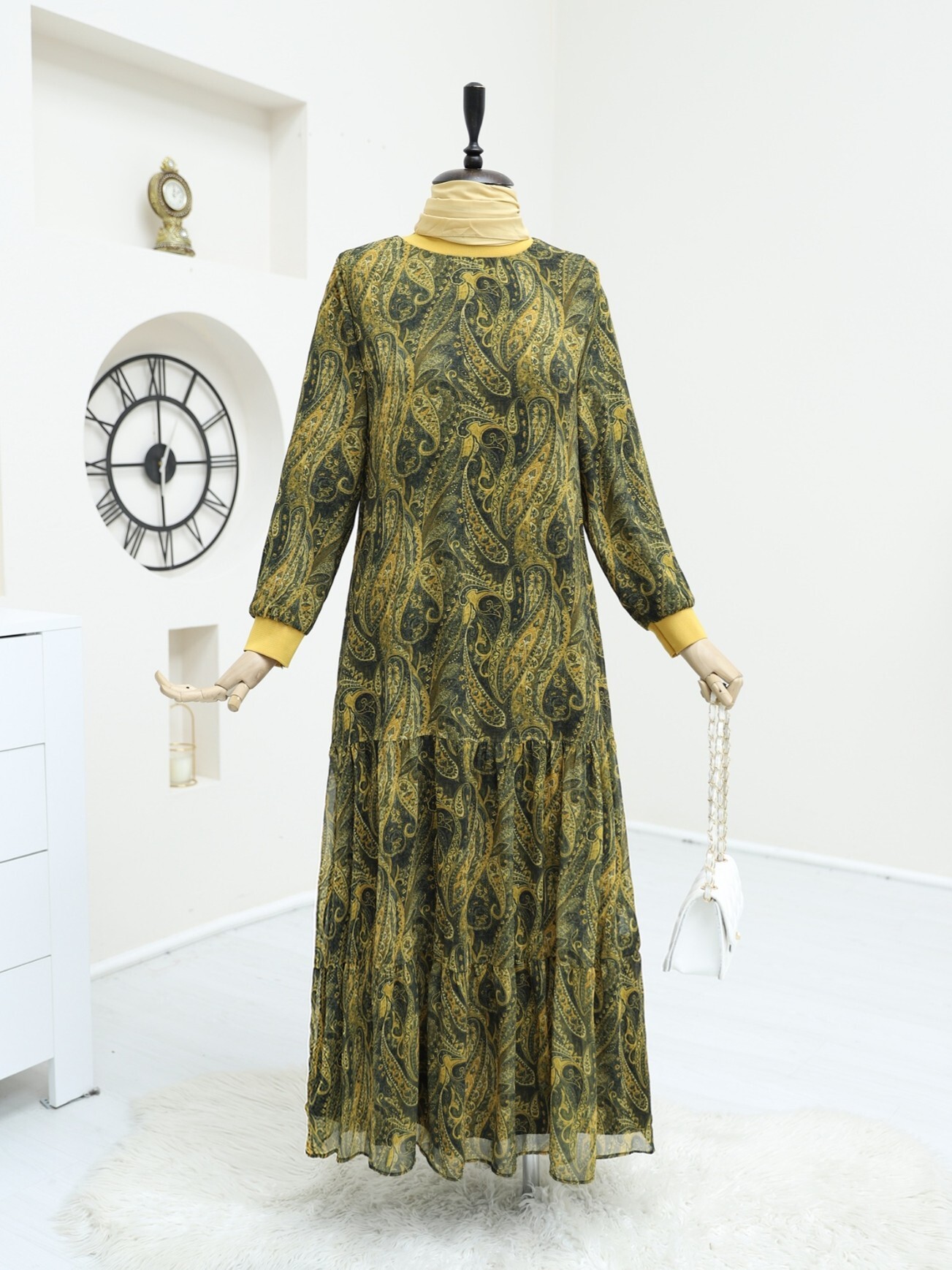 Etnik Desen Eteği Parçalı Astarlı Şifon Elbise -Yağ Yeşili-Yağ Yeşili