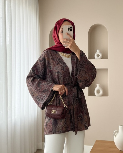 Etnik Desenli Bağcıklı Kimono -Kahve-Kahve