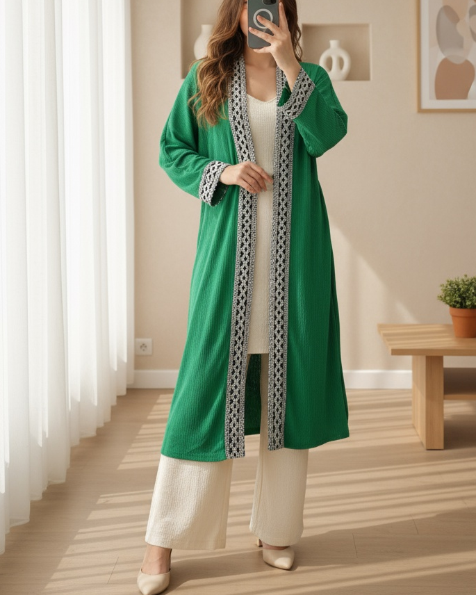 Etnik Şeritli Bağcıklı Uzun Kimono -Yeşil-Yeşil