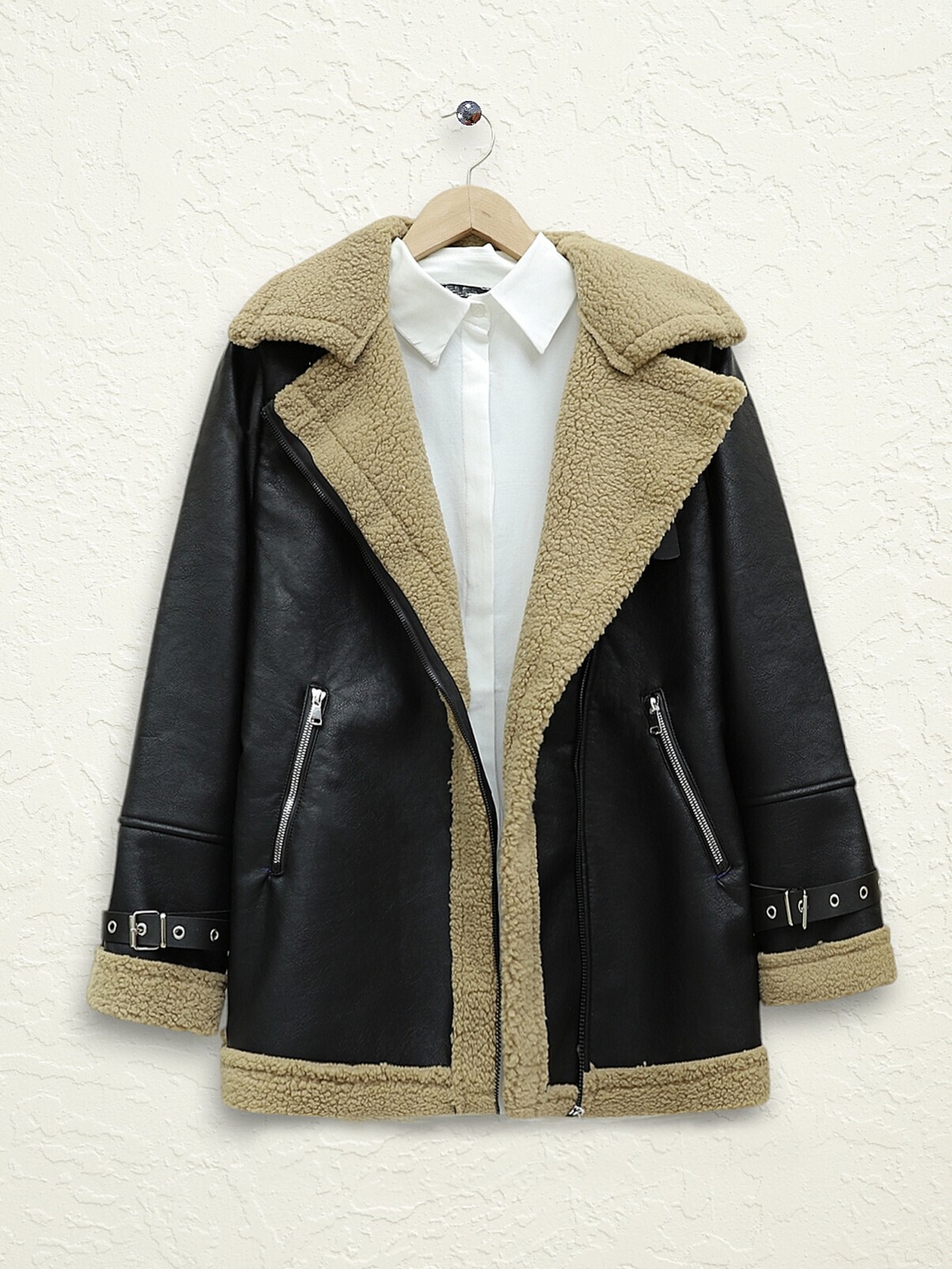 Fermuarlı İçi Peluşlu Deri Ceket -Açık Kahve-Açık Kahve