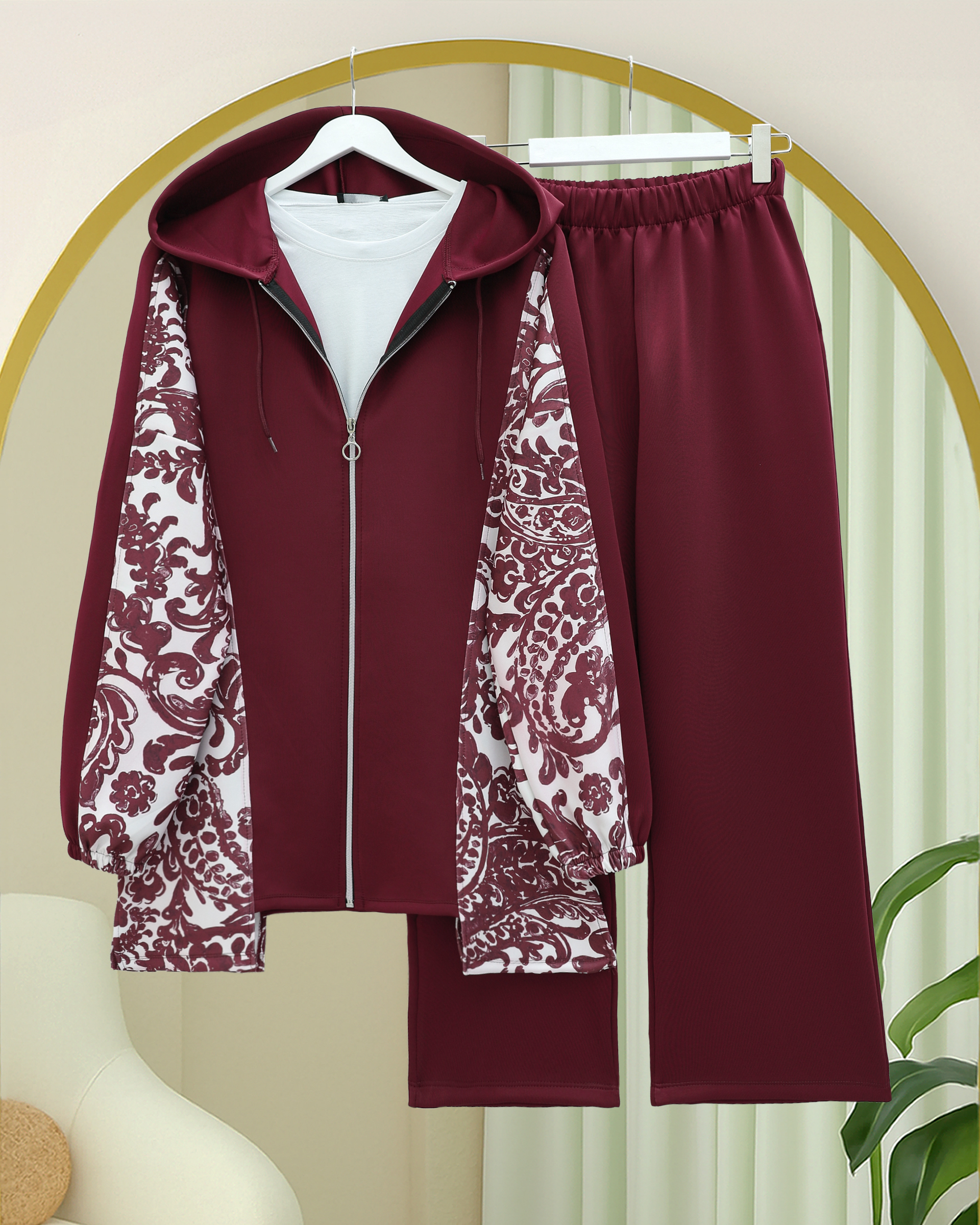 Fermuarlı Kapşonlu Yanları Desenli Scuba Takım -Bordo-Bordo