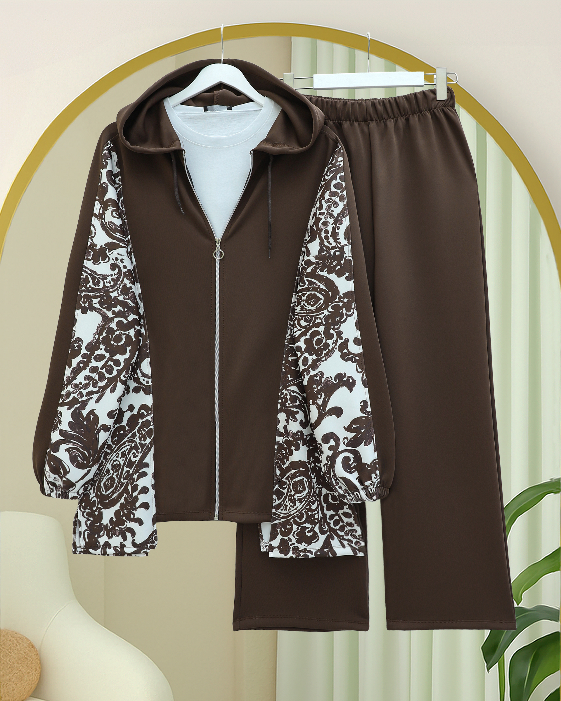 Fermuarlı Kapşonlu Yanları Desenli Scuba Takım -Kahve-Kahve