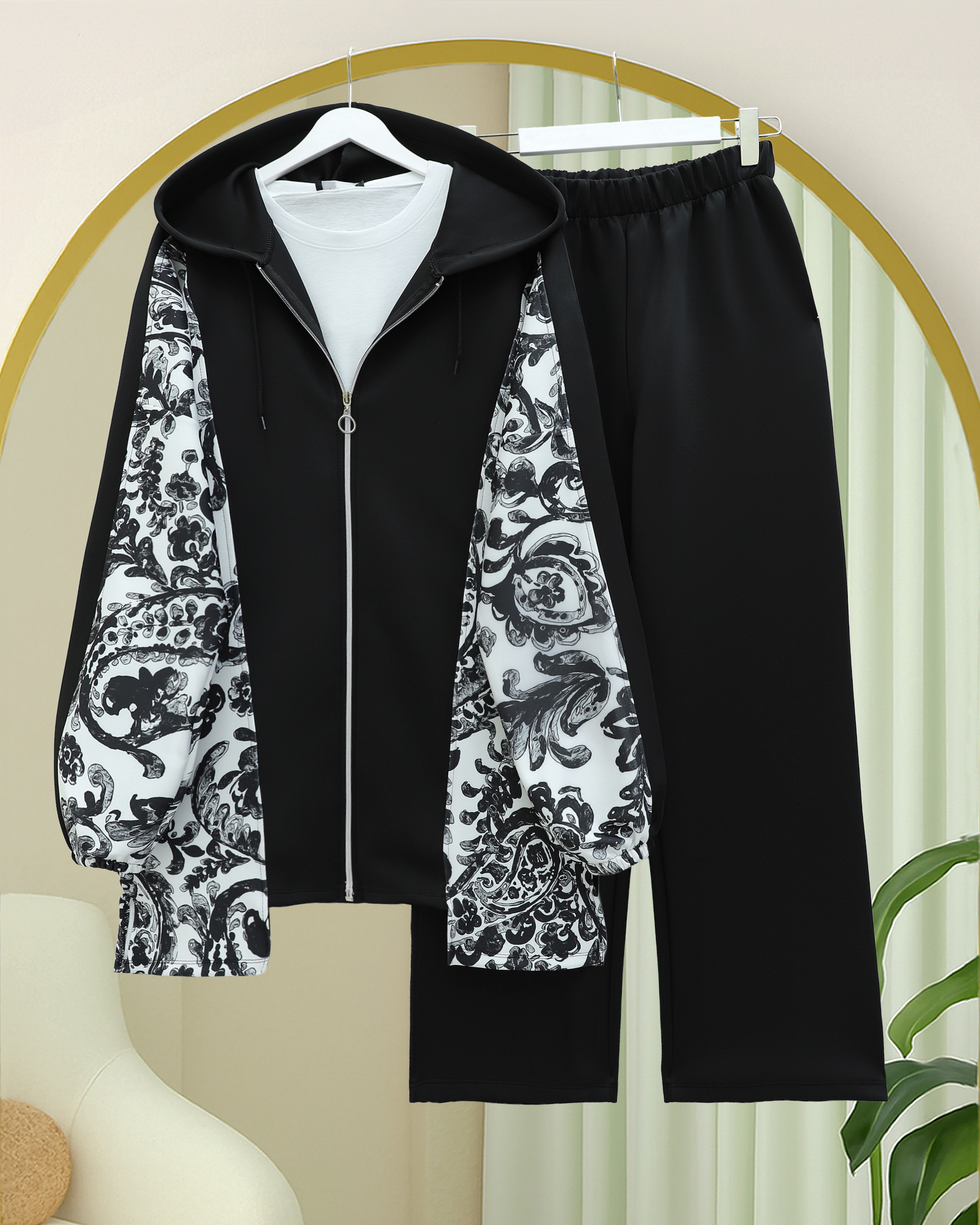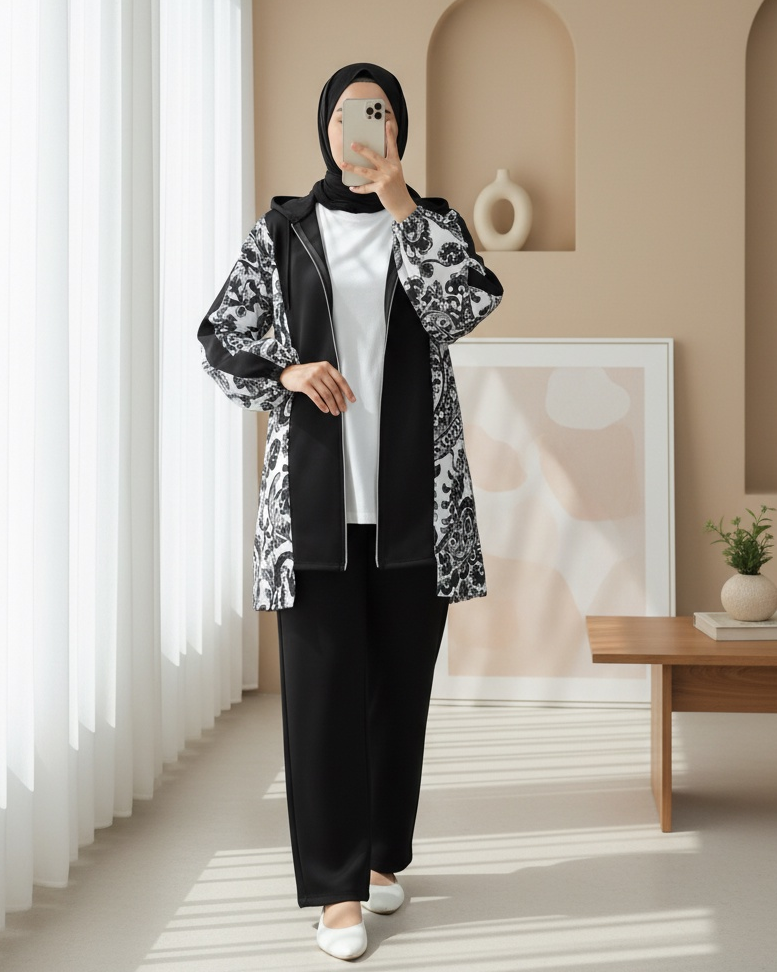 Fermuarlı Kapşonlu Yanları Desenli Scuba Takım -Siyah-siyah