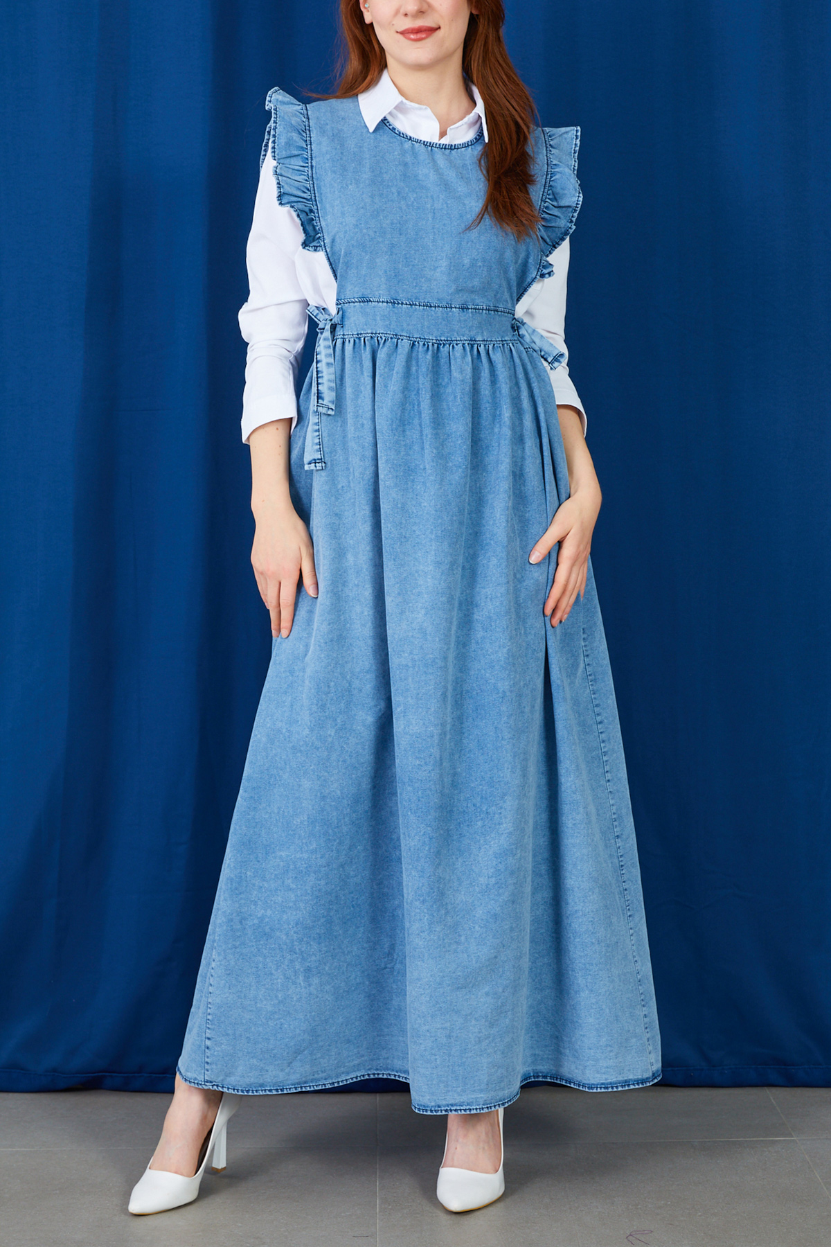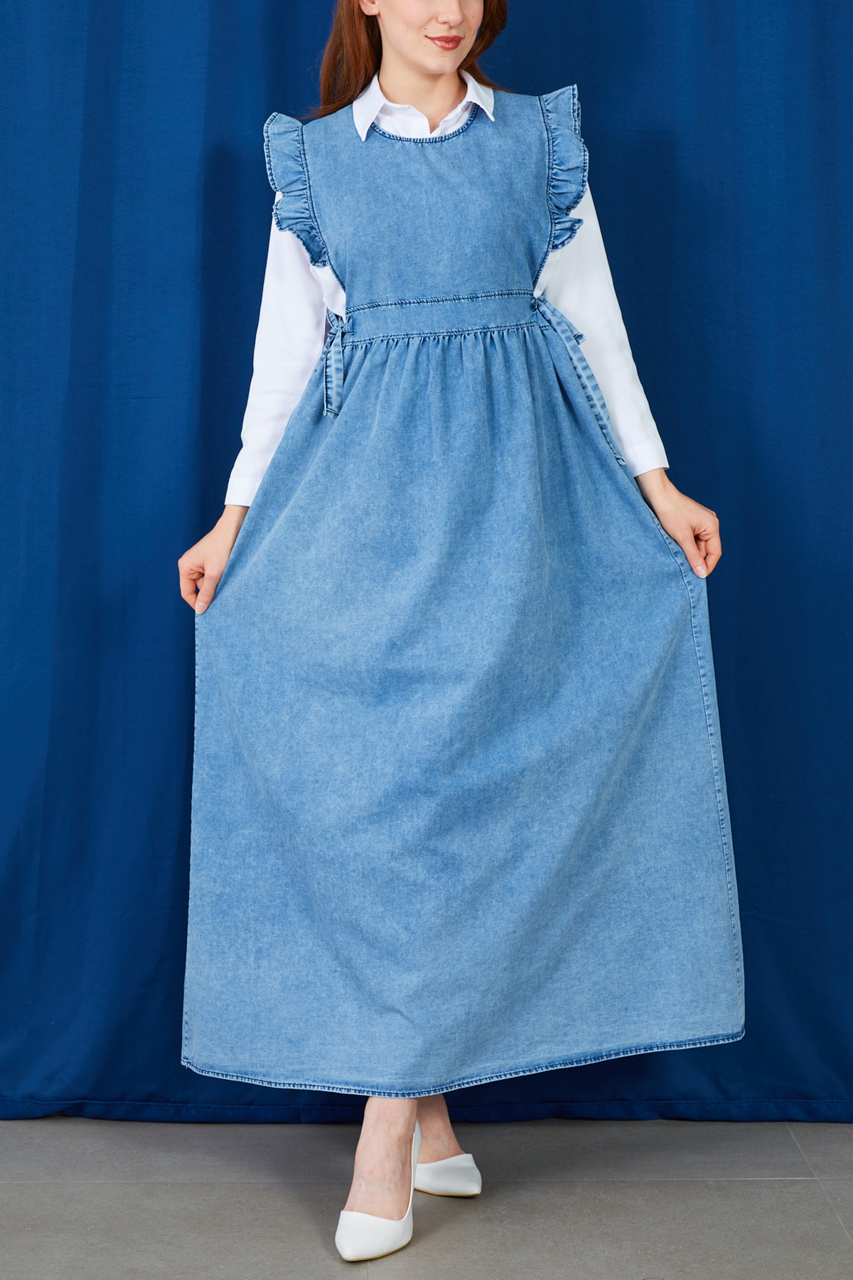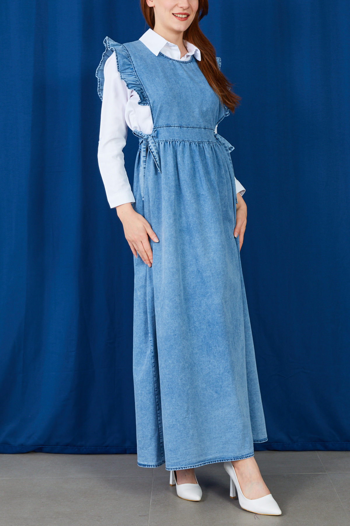 Fırfır Detaylı Yanlardan Bağlamalı Jile Kot Elbise-Mavi