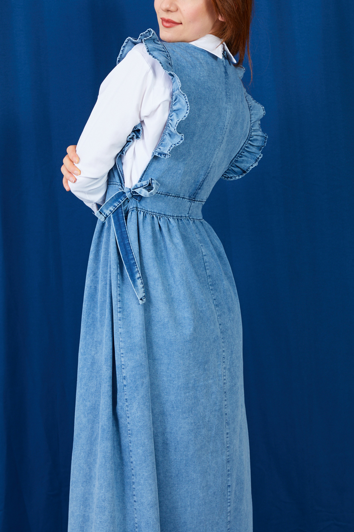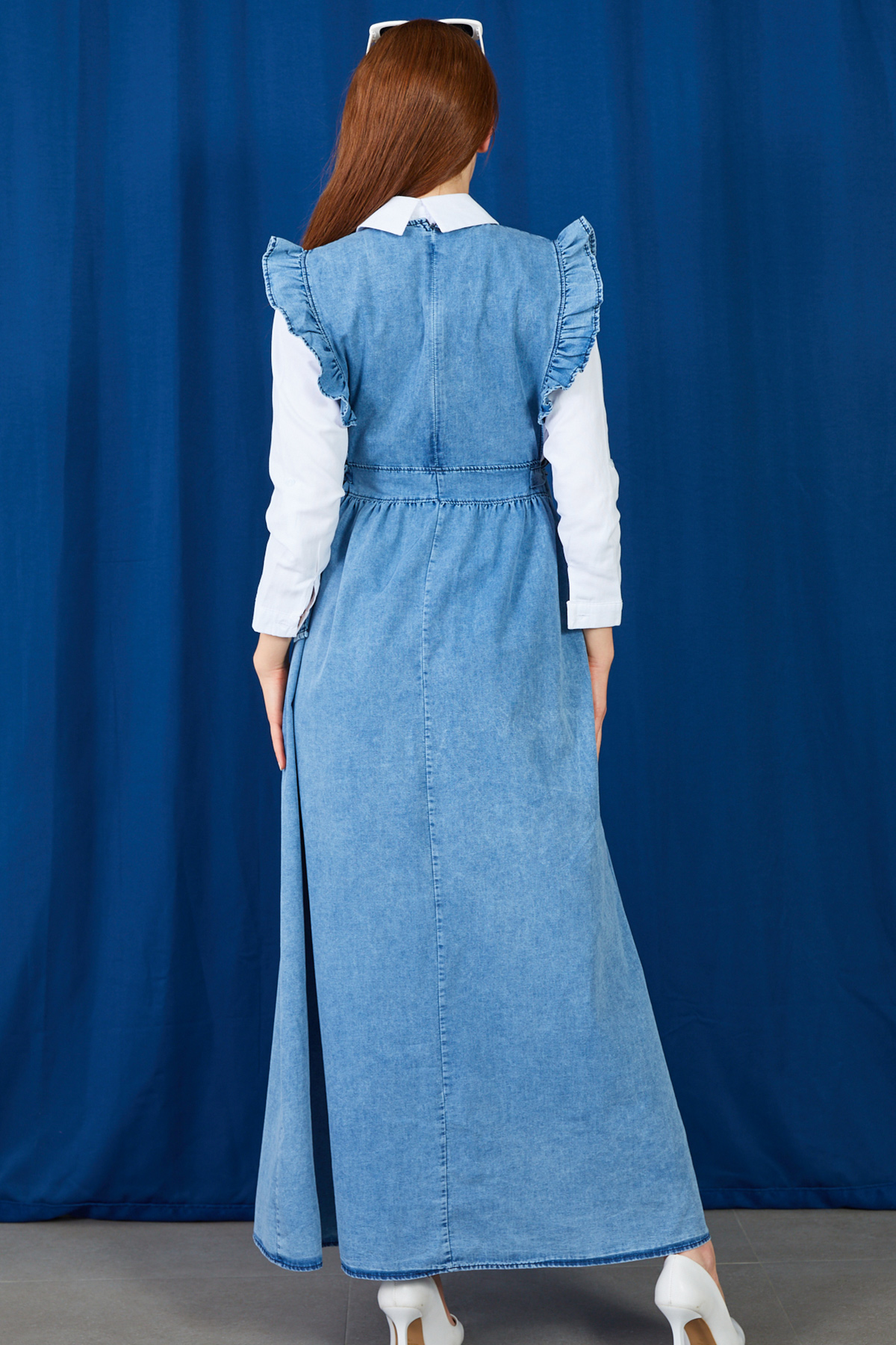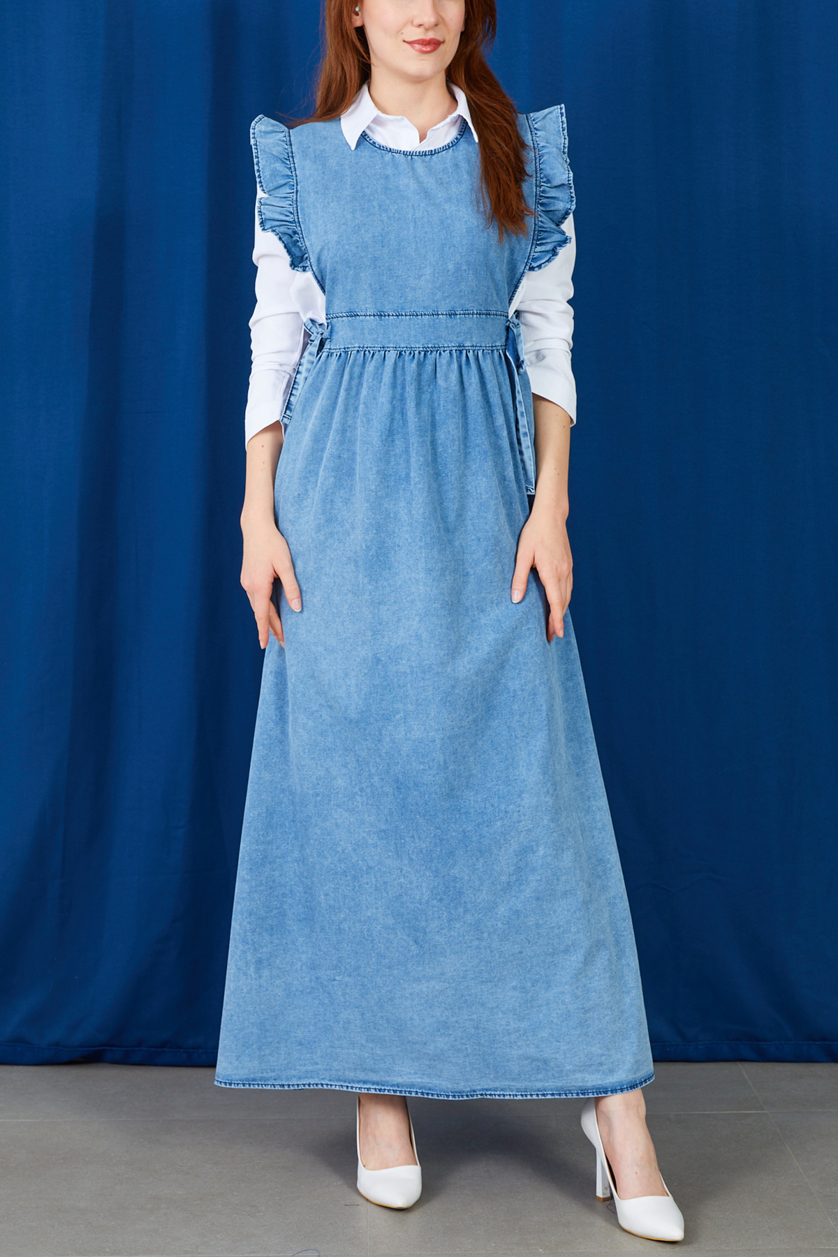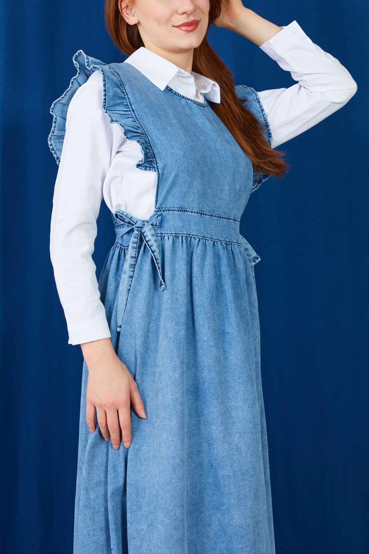 Fırfır Detaylı Yanlardan Bağlamalı Jile Kot Elbise-Mavi