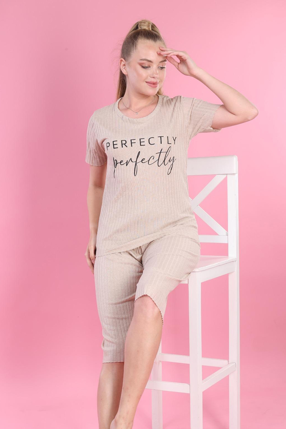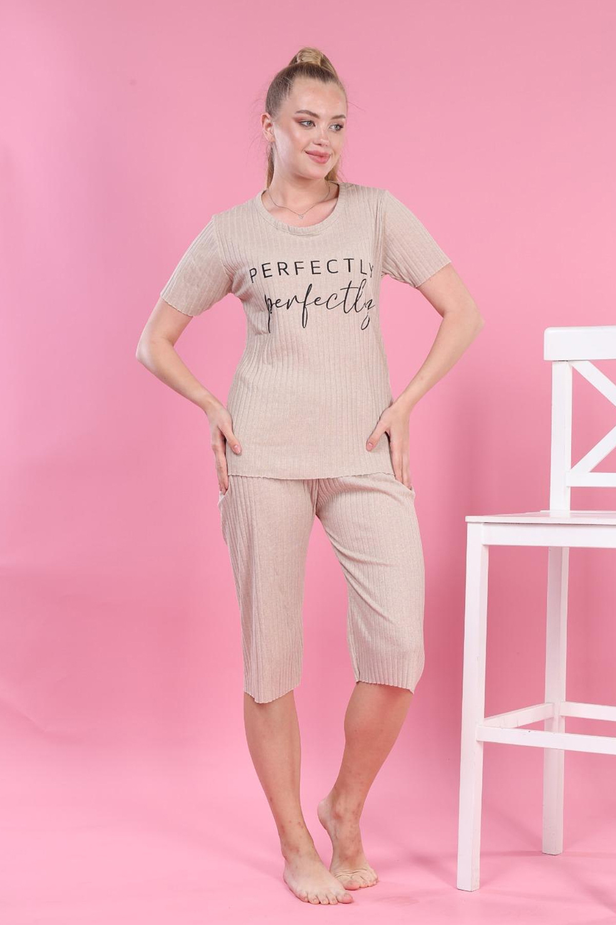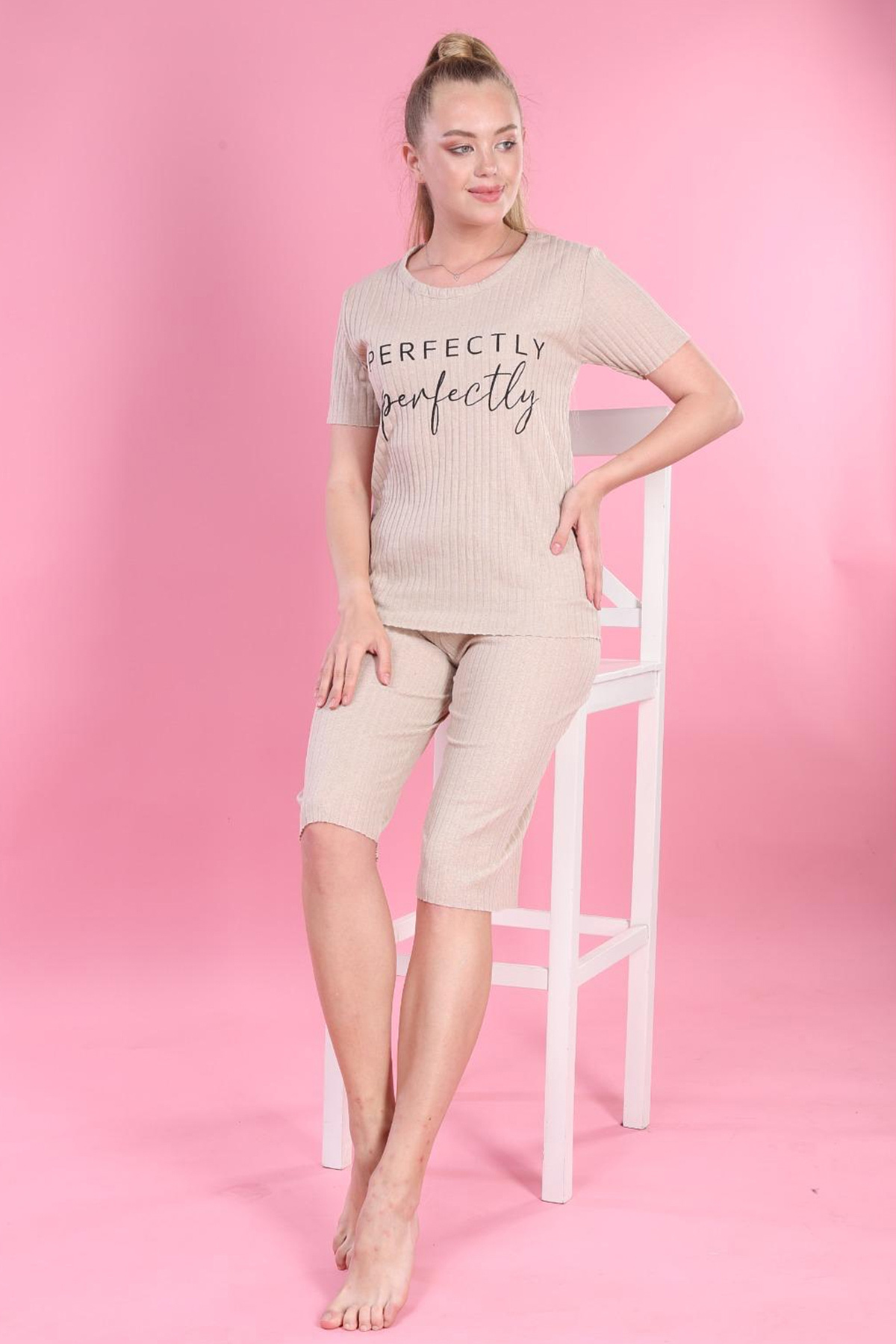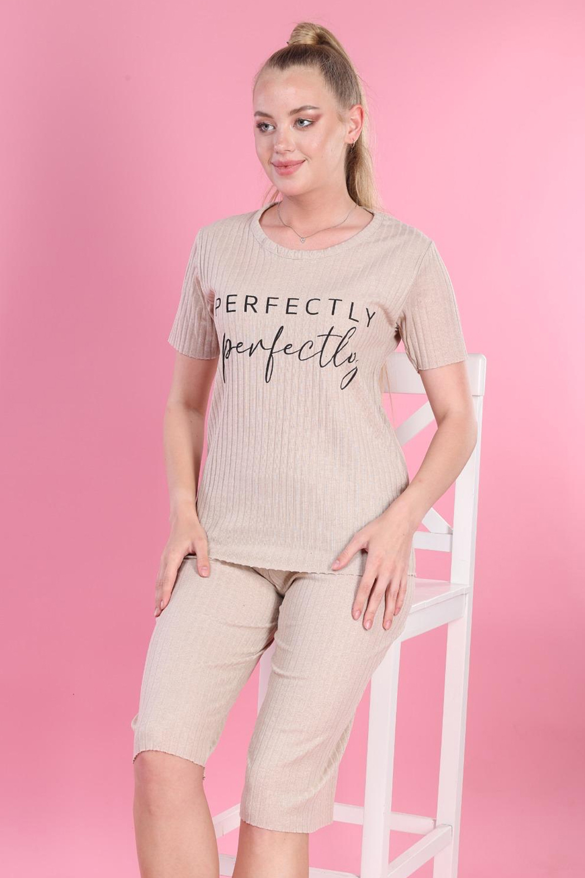 Fitilli Baskılı Pijama Takımı Bej-Bej