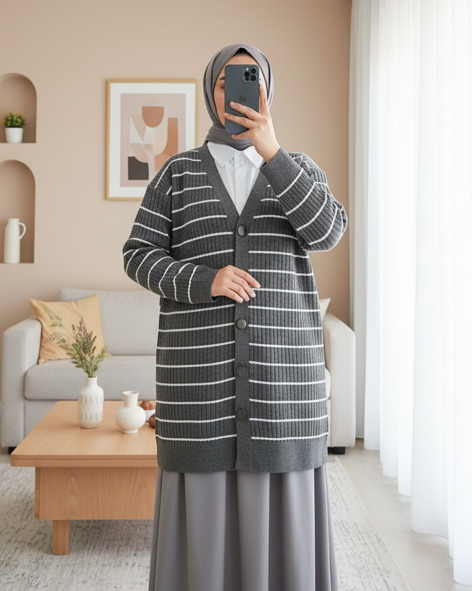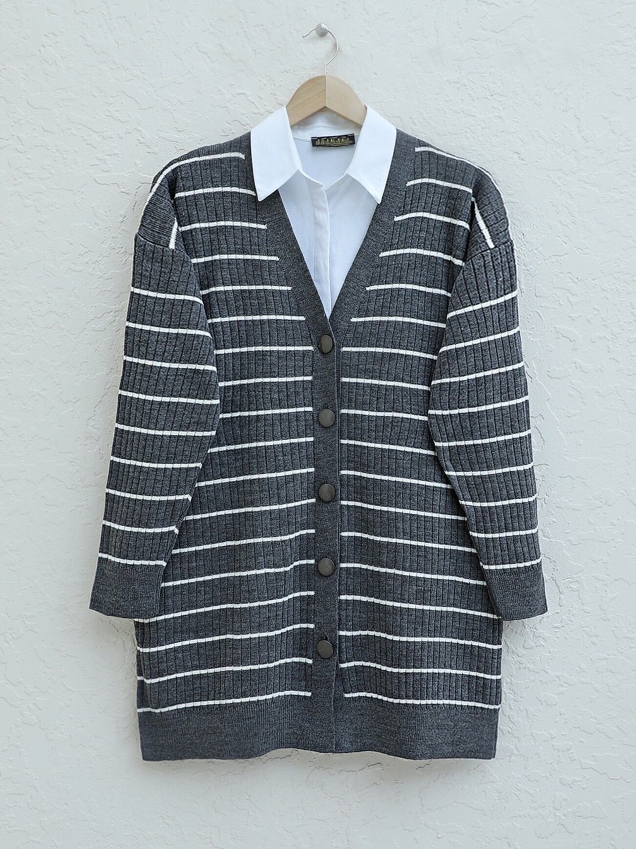 Fitilli Düğmeli Uzun Triko Hırka -Füme-Füme