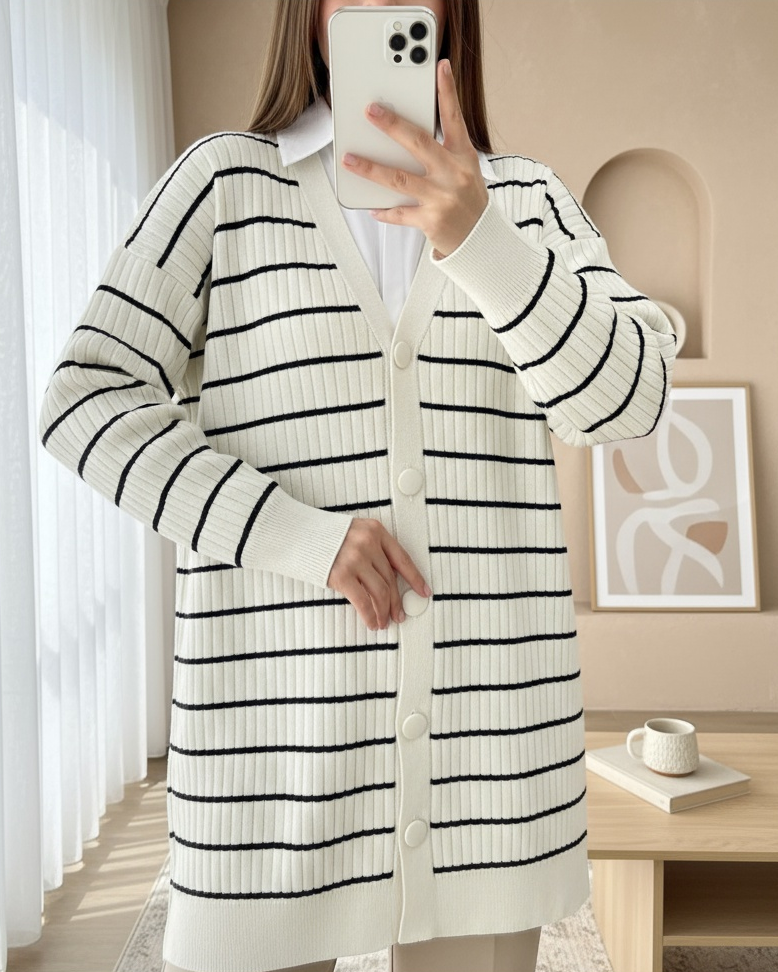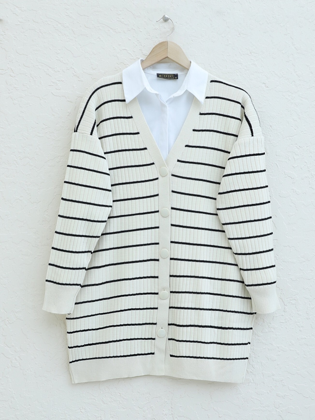 Fitilli Düğmeli Uzun Triko Hırka -Krem-Krem