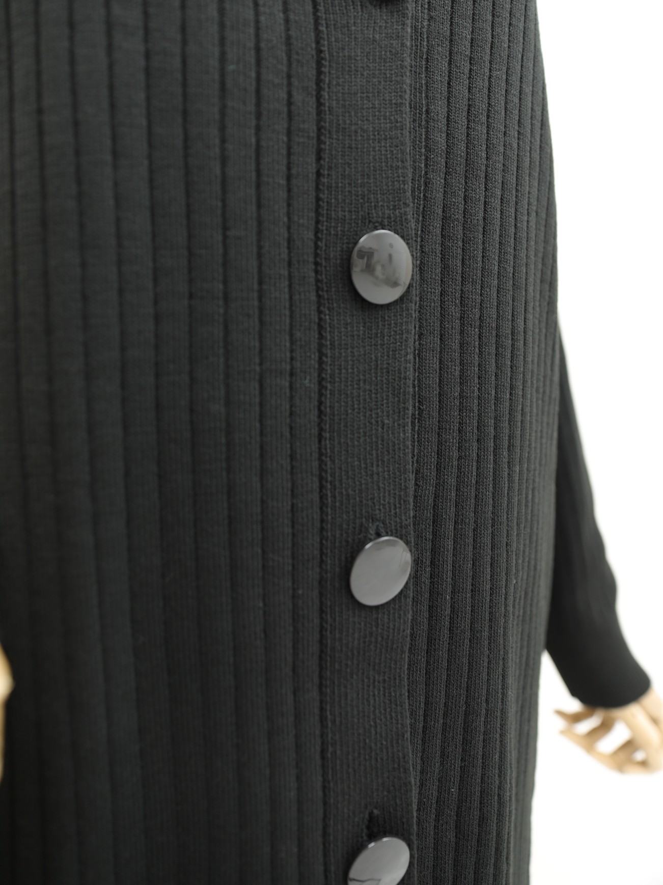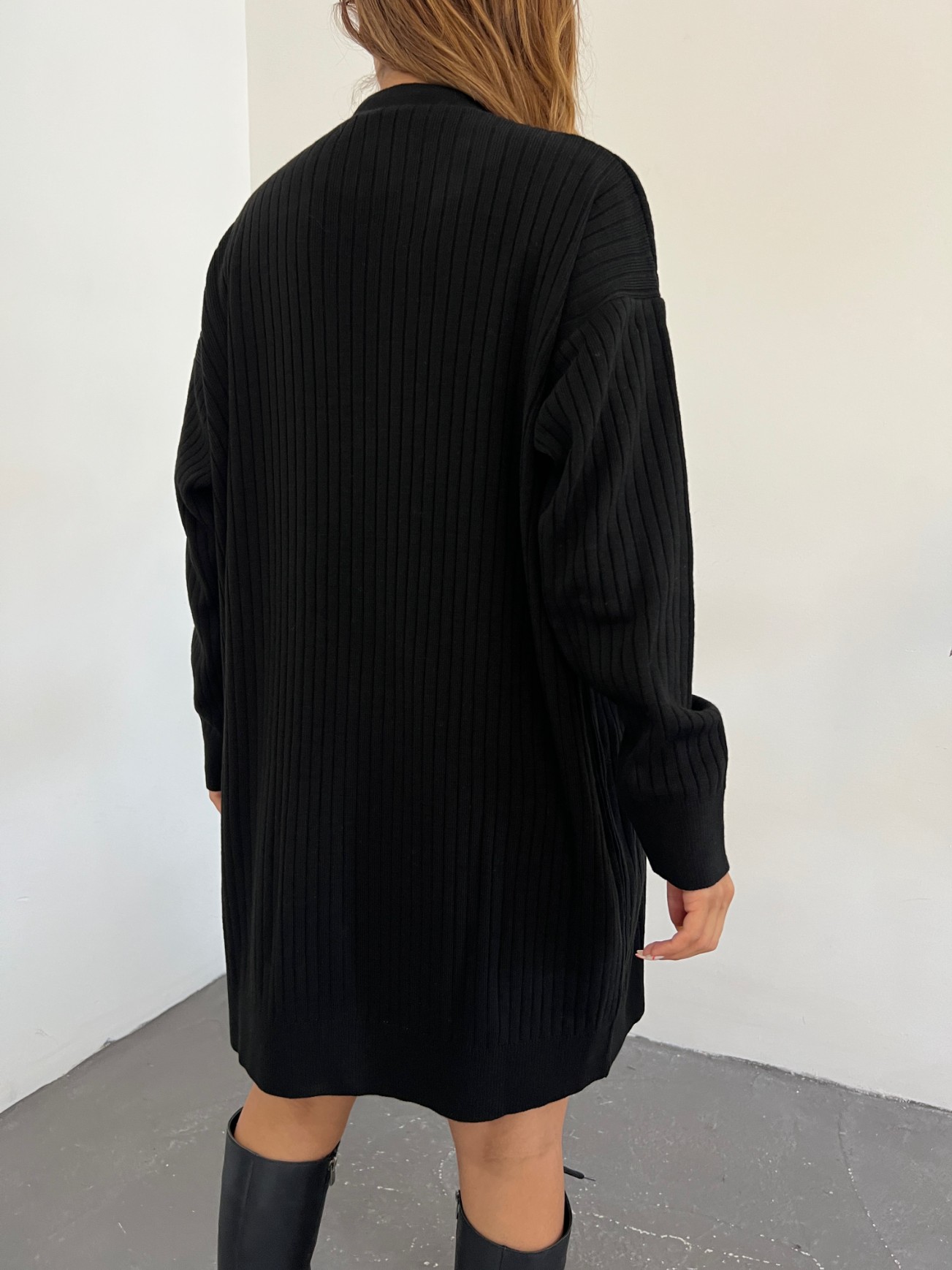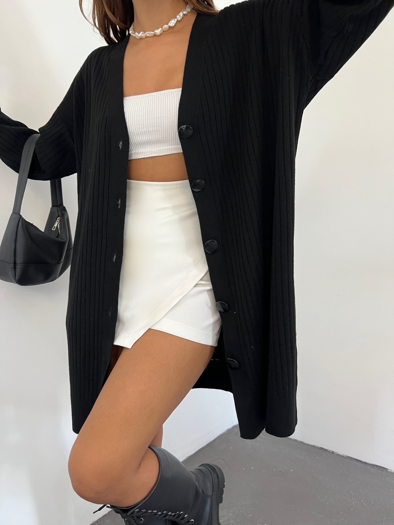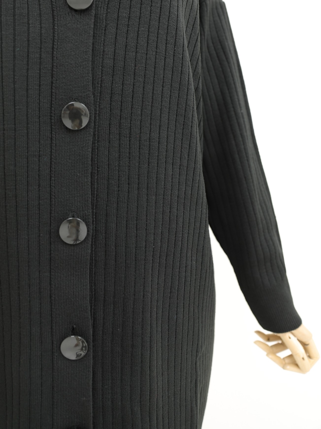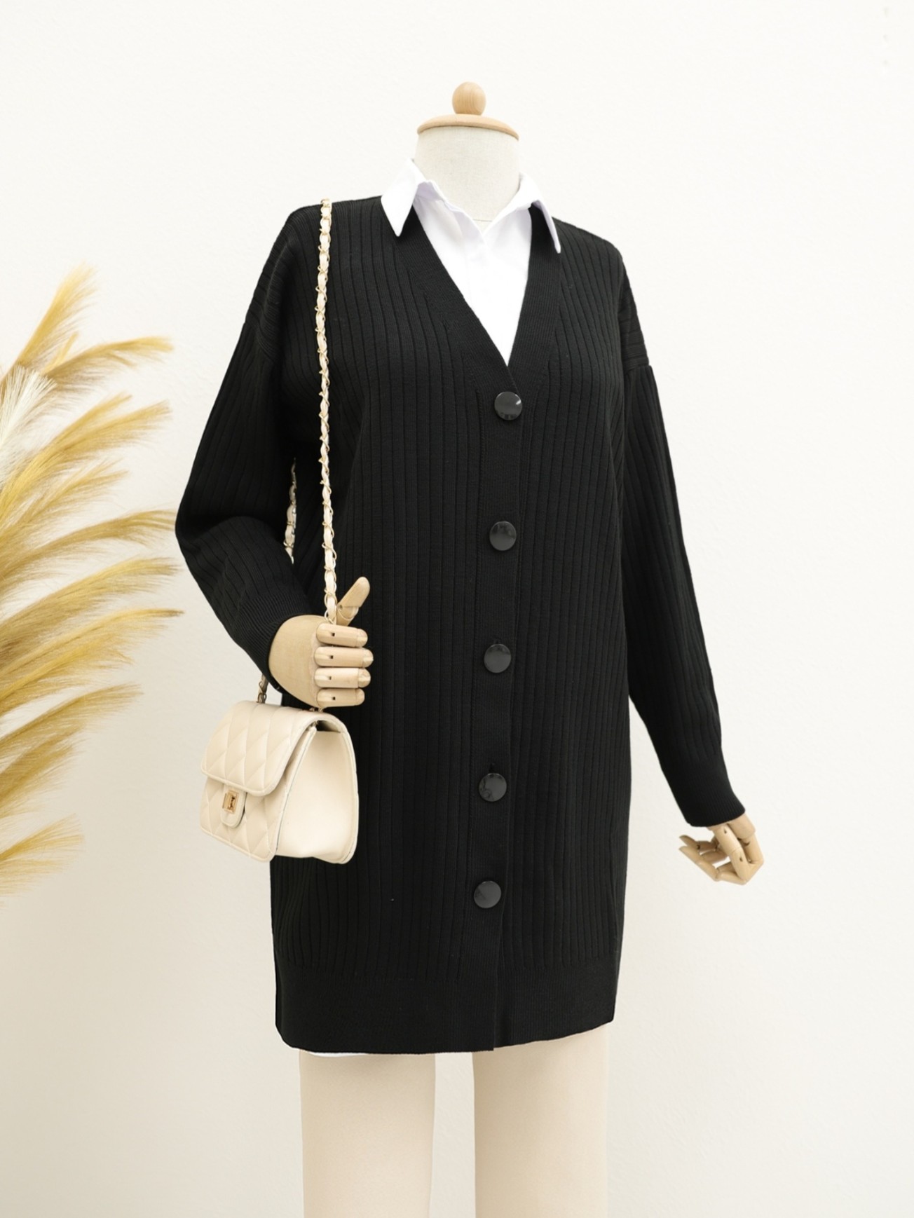 Fitilli Düğmeli Uzun Triko Hırka -Siyah-siyah