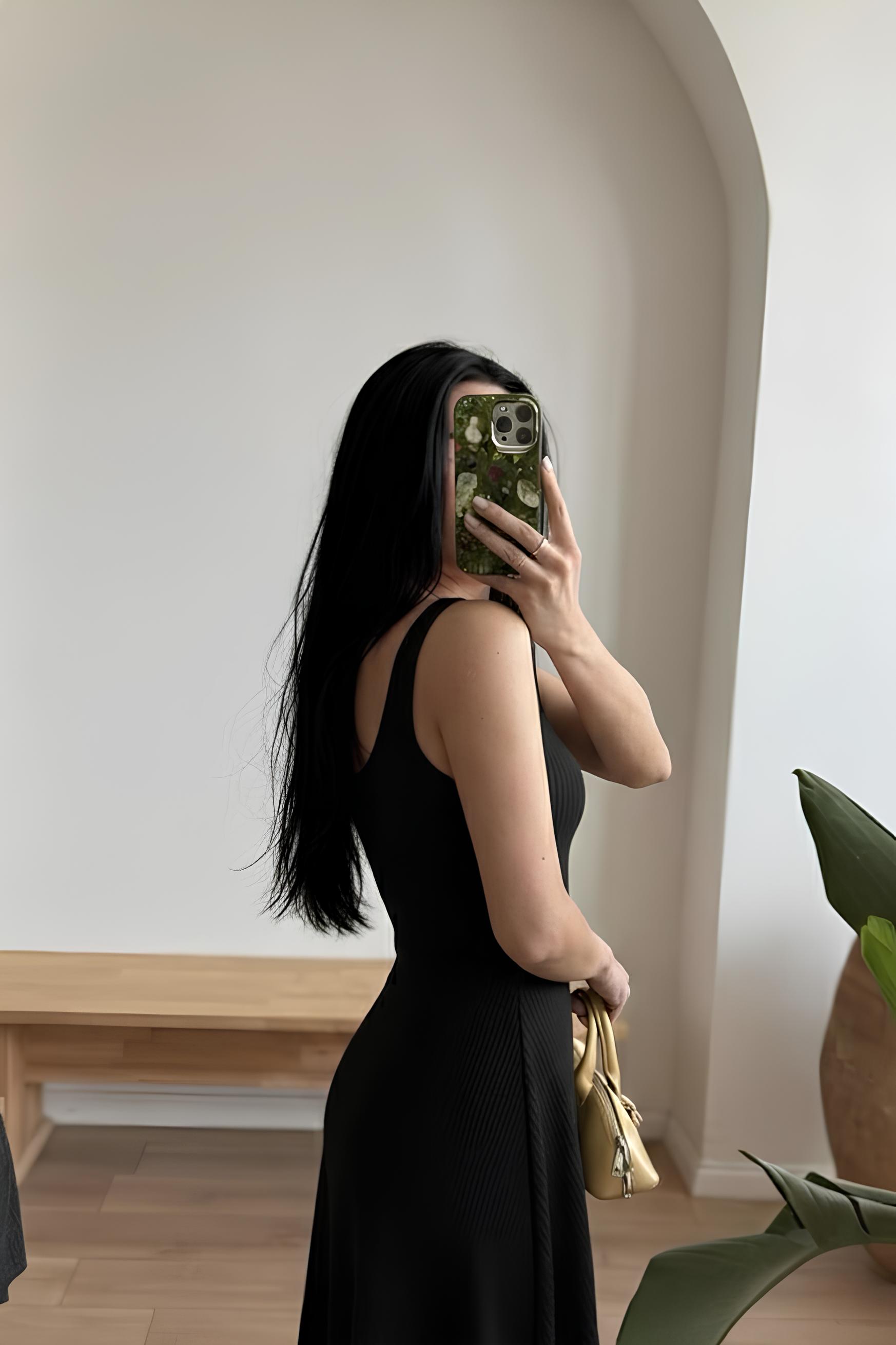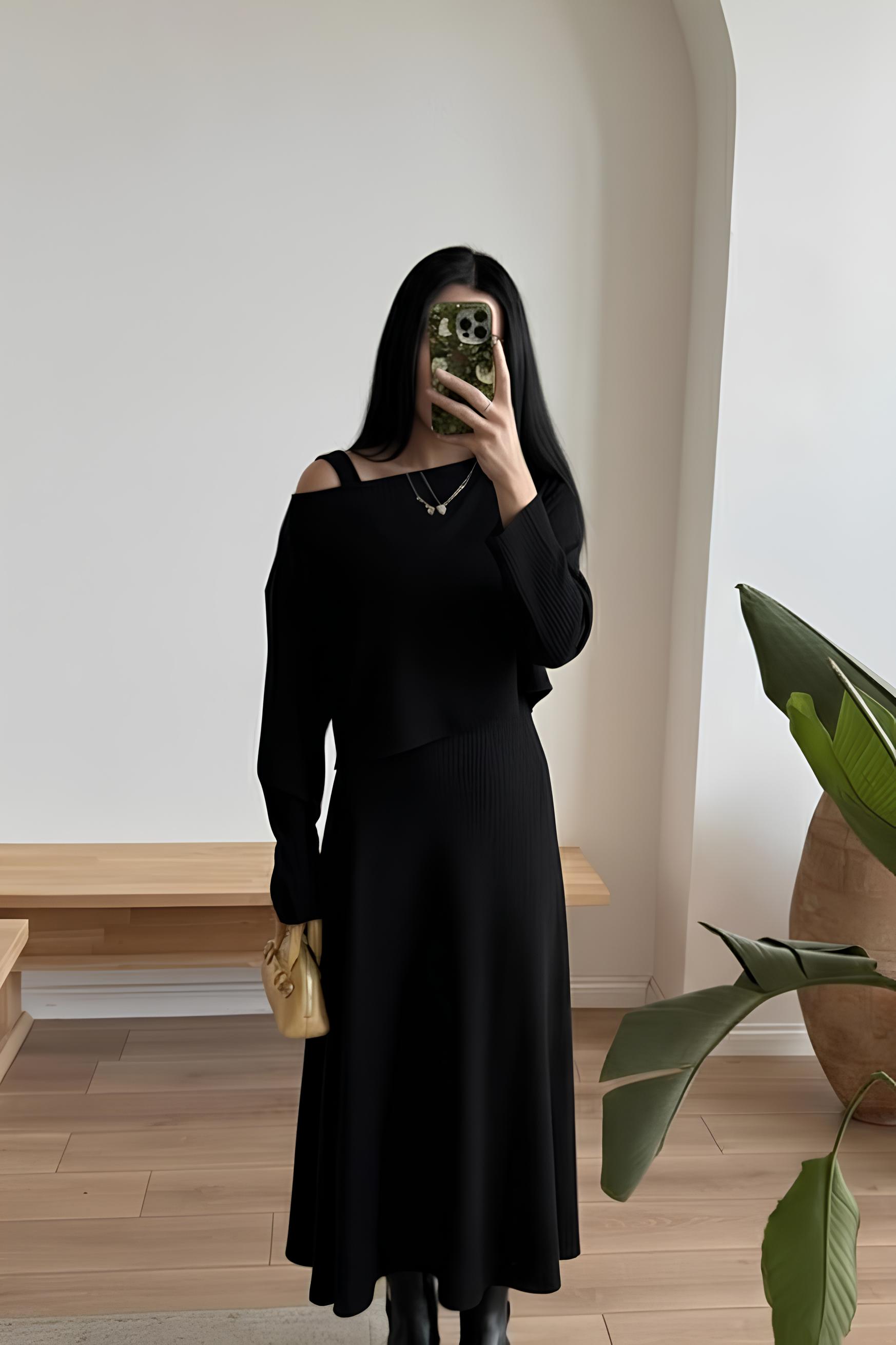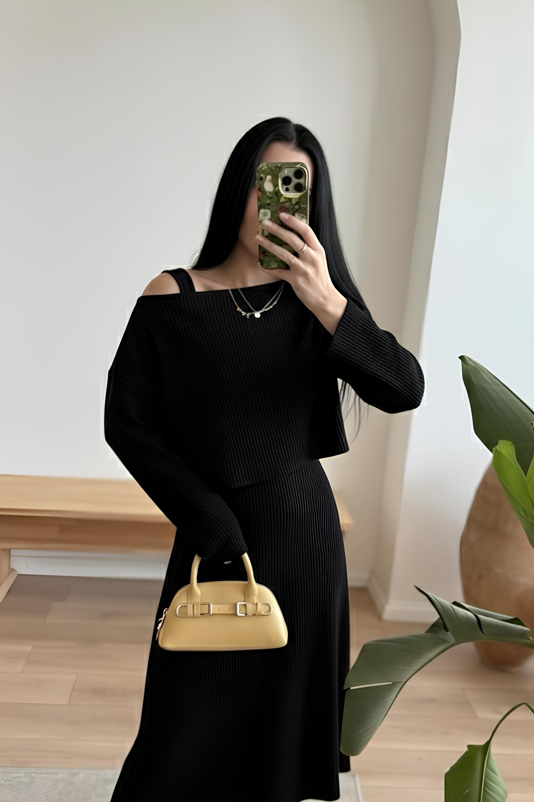 Fitilli Örme Bluz Elbise Takım Siyah - 9557-Siyah