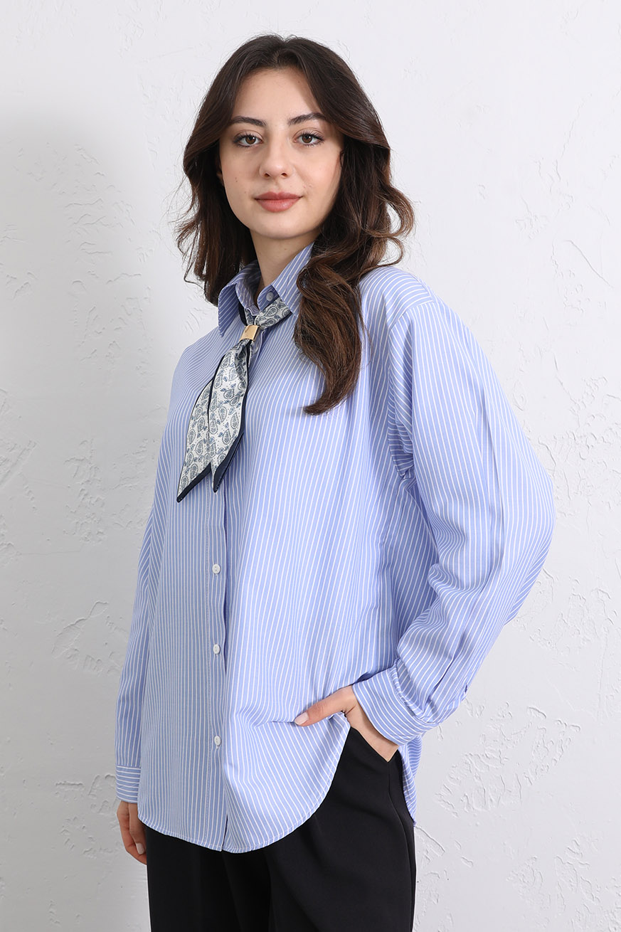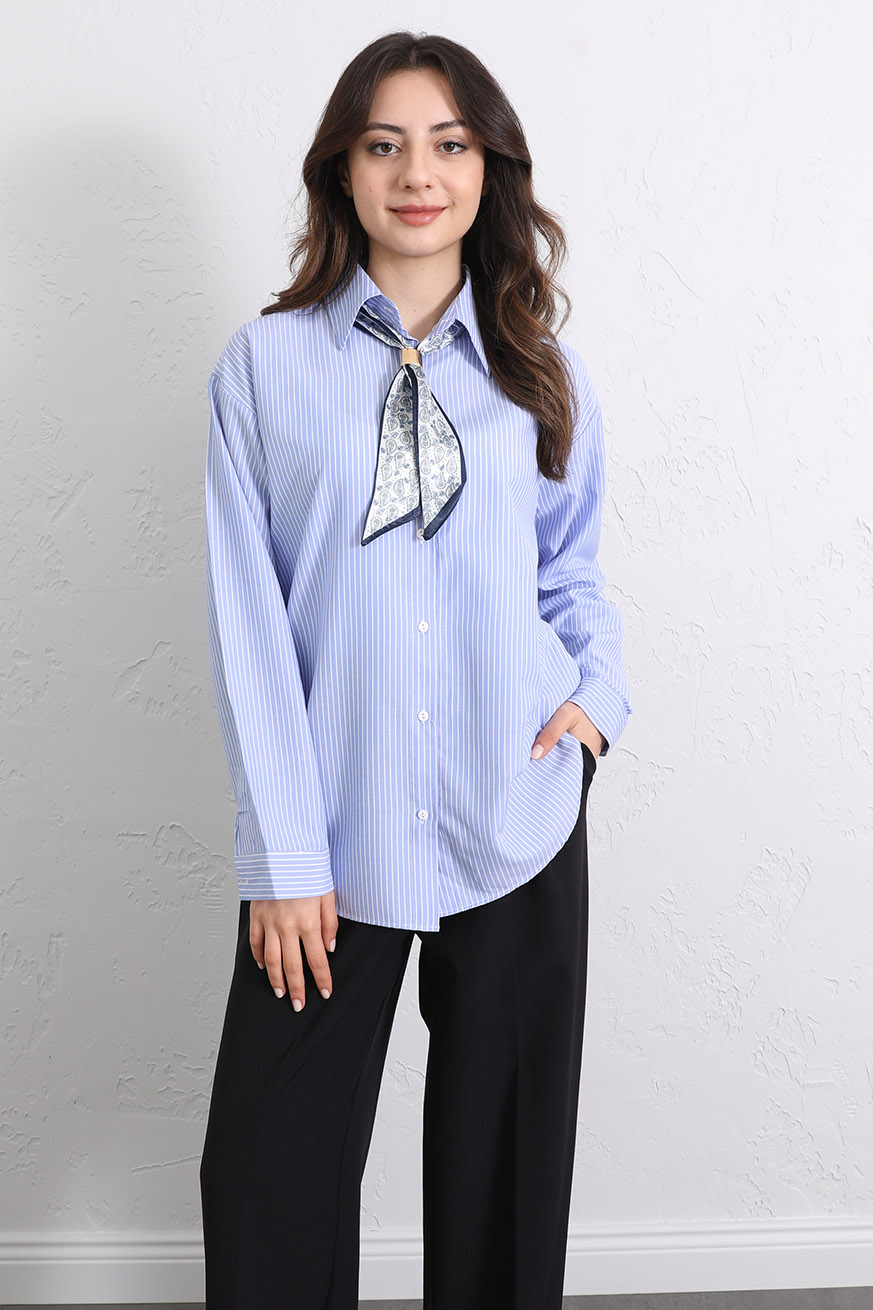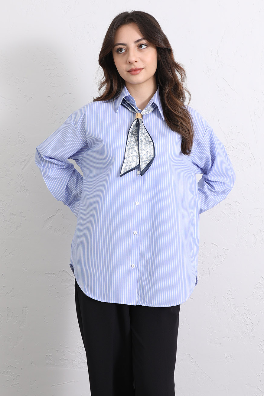 Fular Aksesuarlı Çizgili Gömlek Mavi - 8035-Mavi