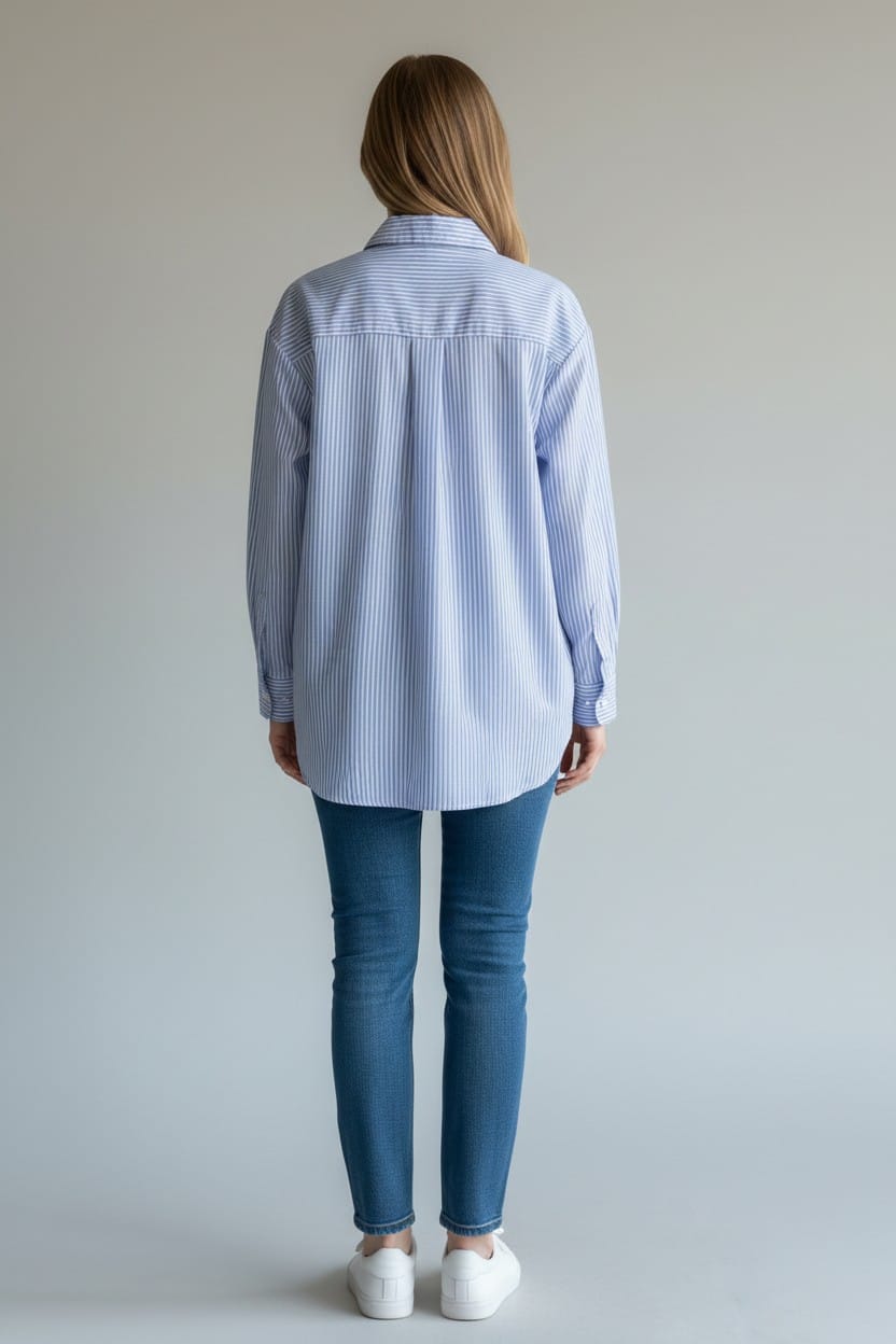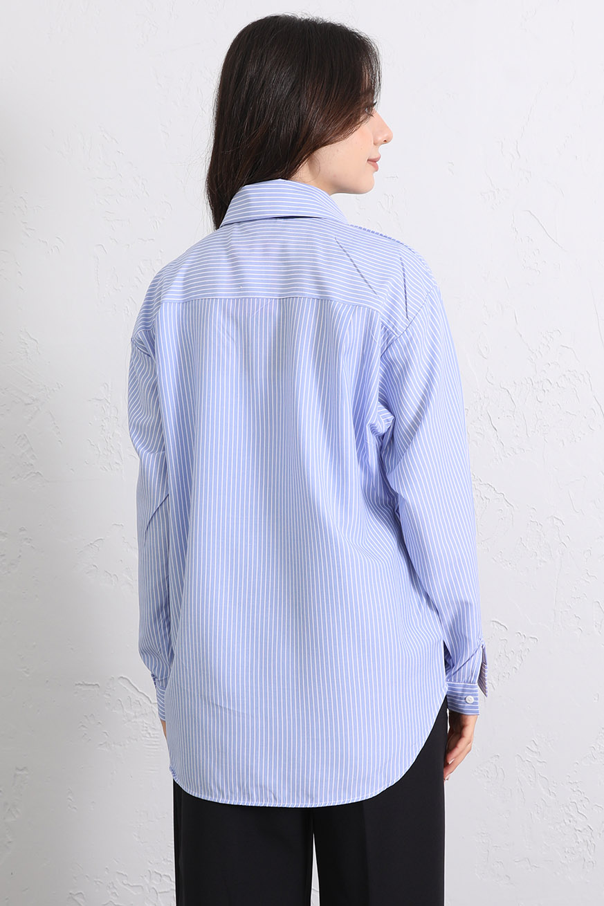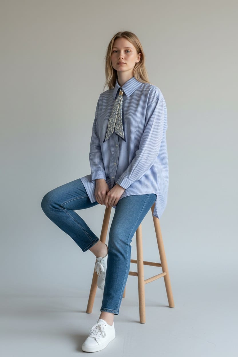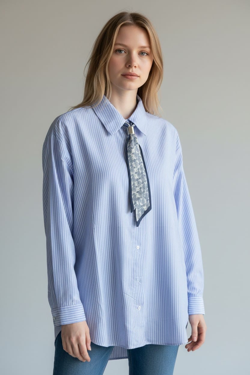 Fular Aksesuarlı Çizgili Gömlek Mavi - 8035-Mavi