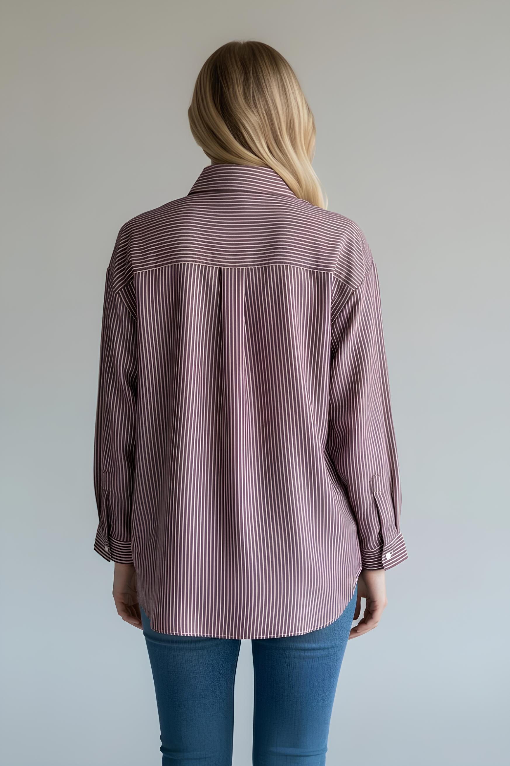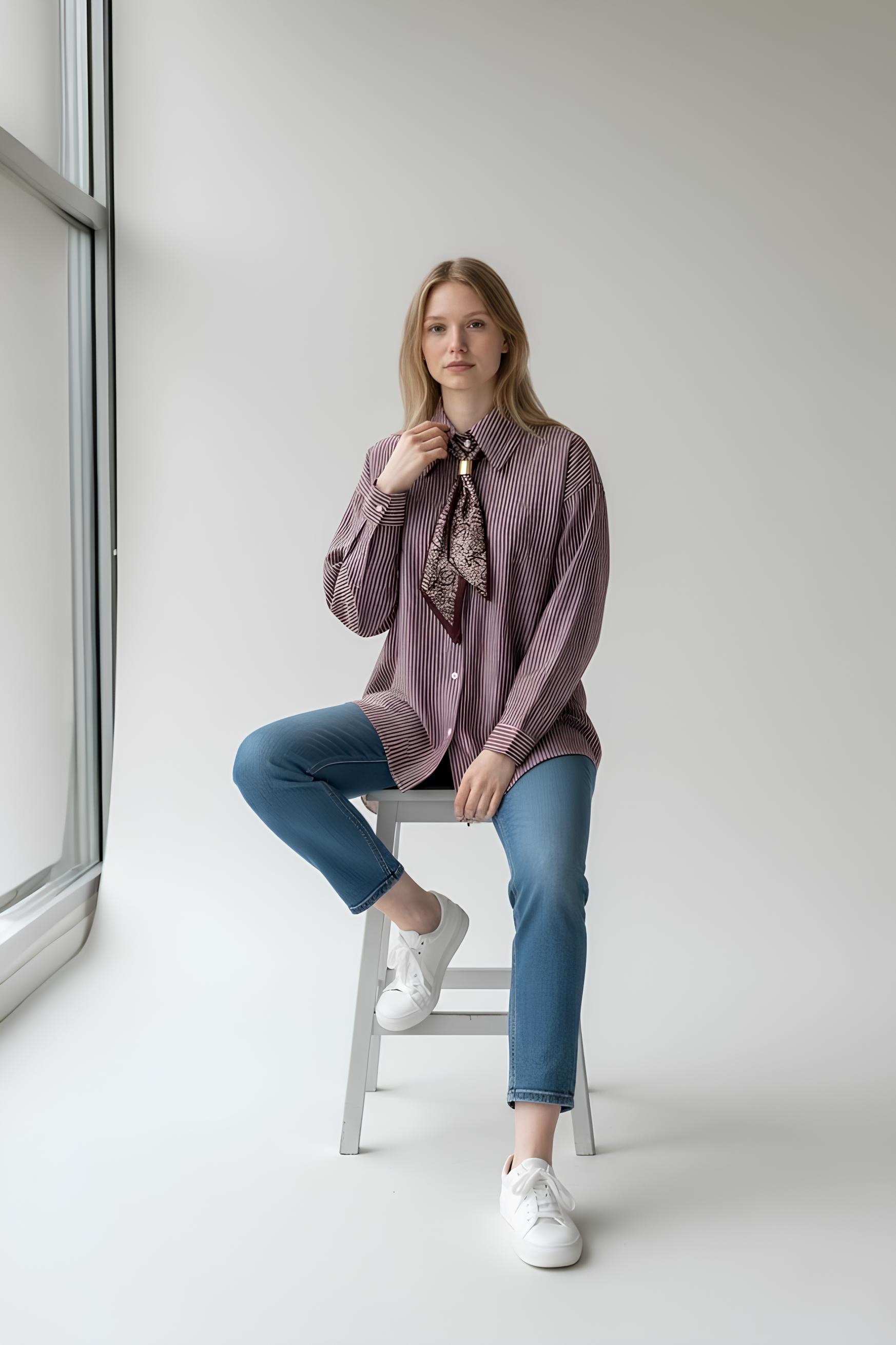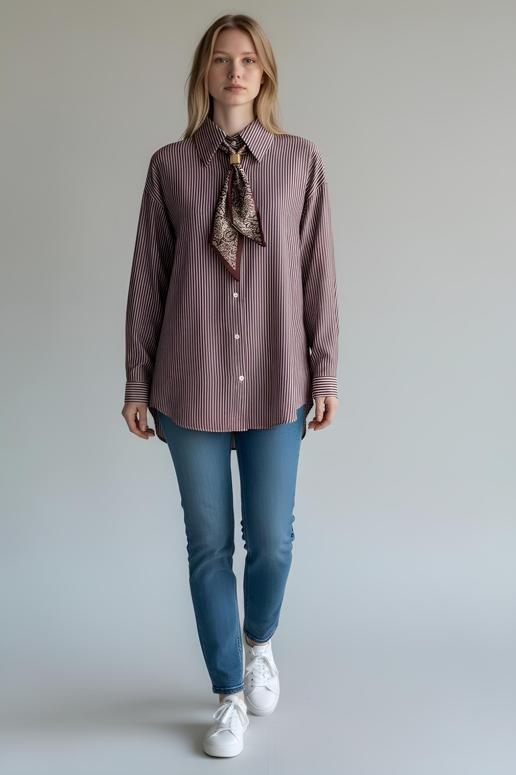 Fular Aksesuarlı Çizgili Gömlek Bordo - 8035-Bordo