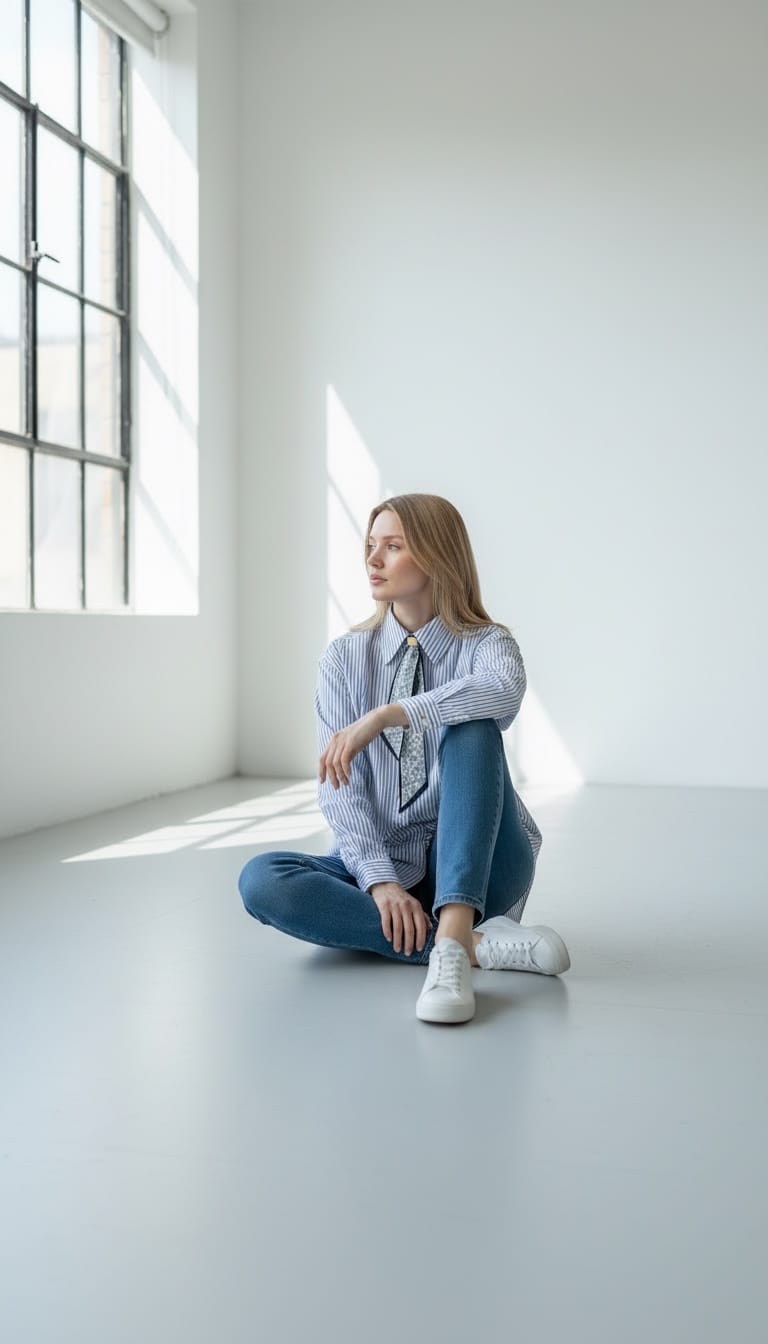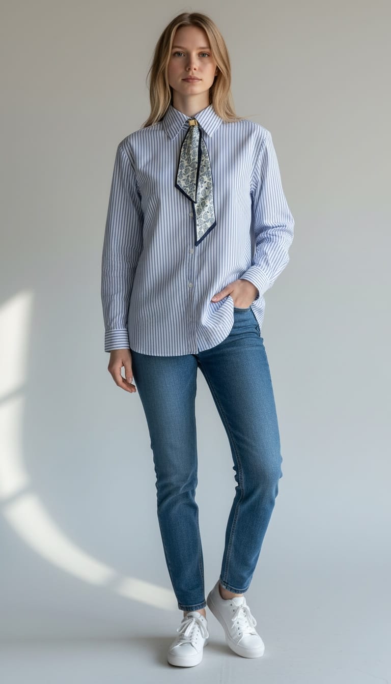 Fular Aksesuarlı Çizgili Gömlek Beyaz - 8035-Beyaz