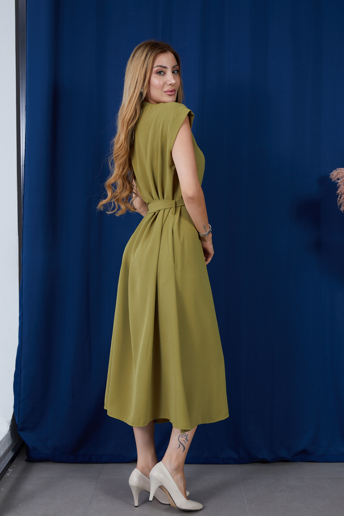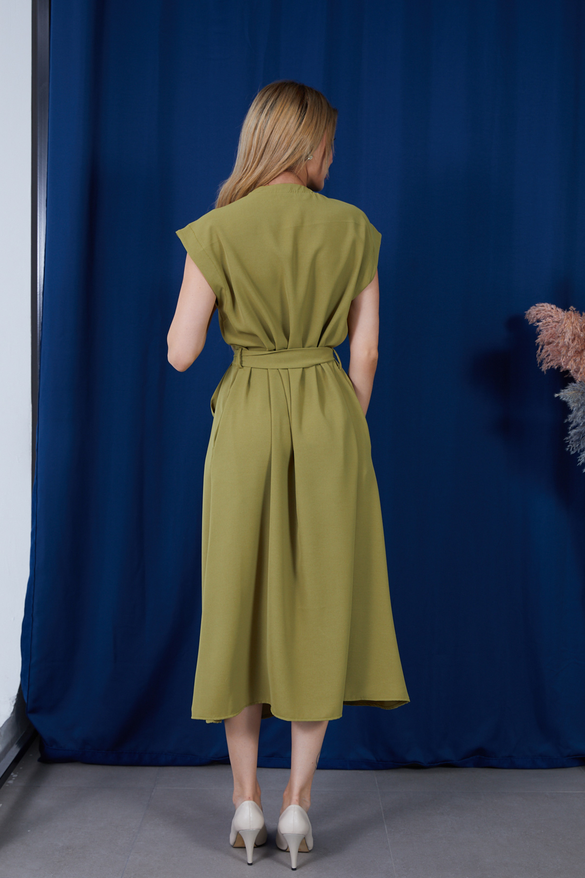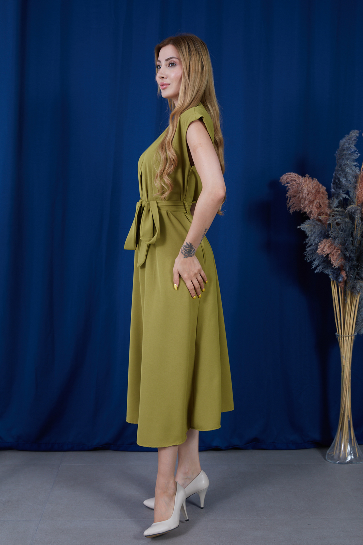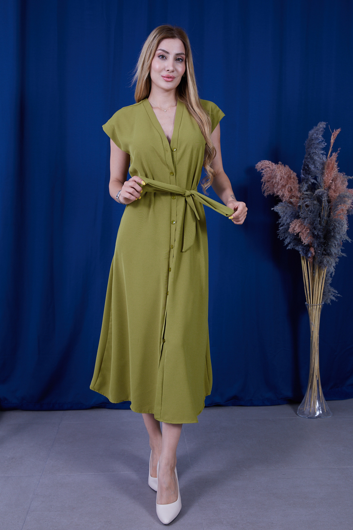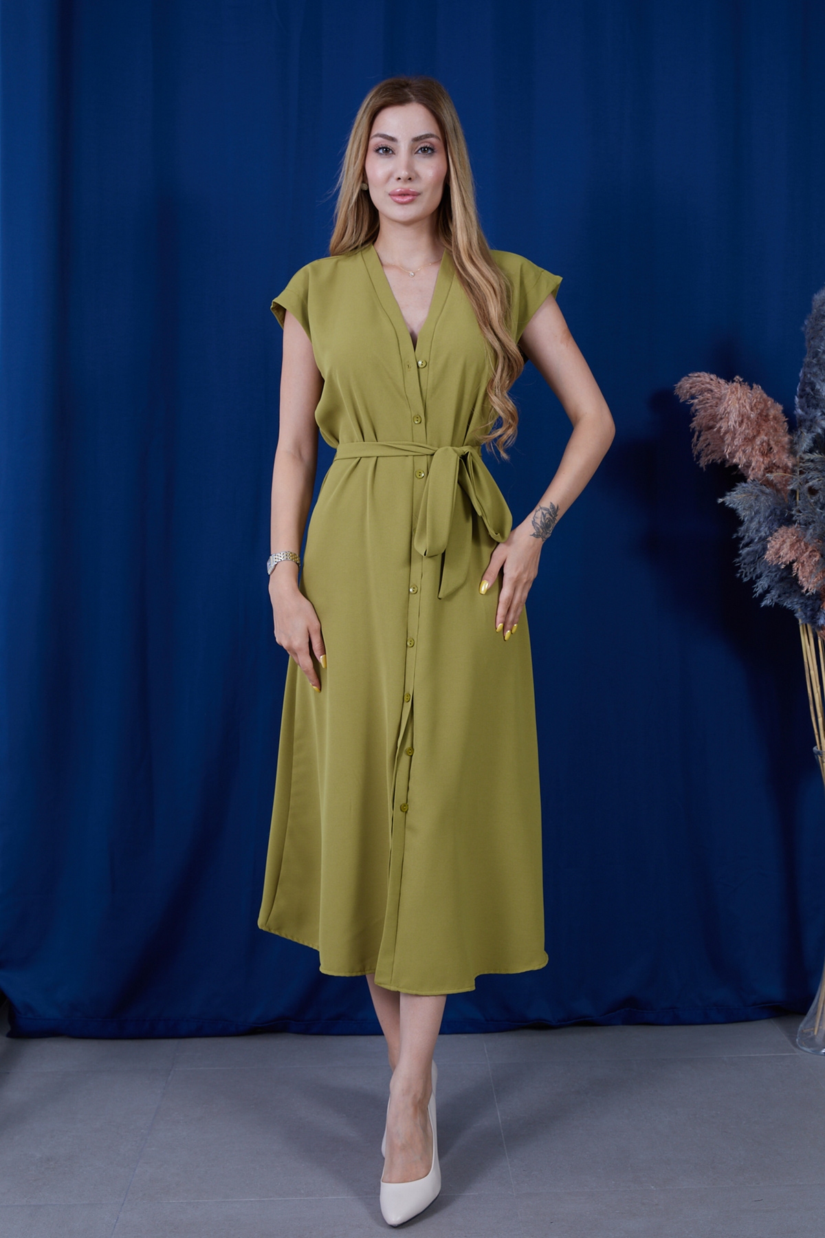 Geniş Kalıp Kuşaklı Önü Düğmeli Linda Kumaş Elbise-Yağ Yeşili