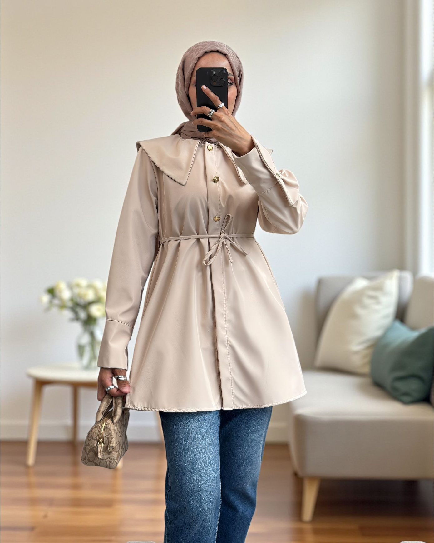 Geniş Yakalı Beli Bağlamalı Bonding Kap -Bej-Bej