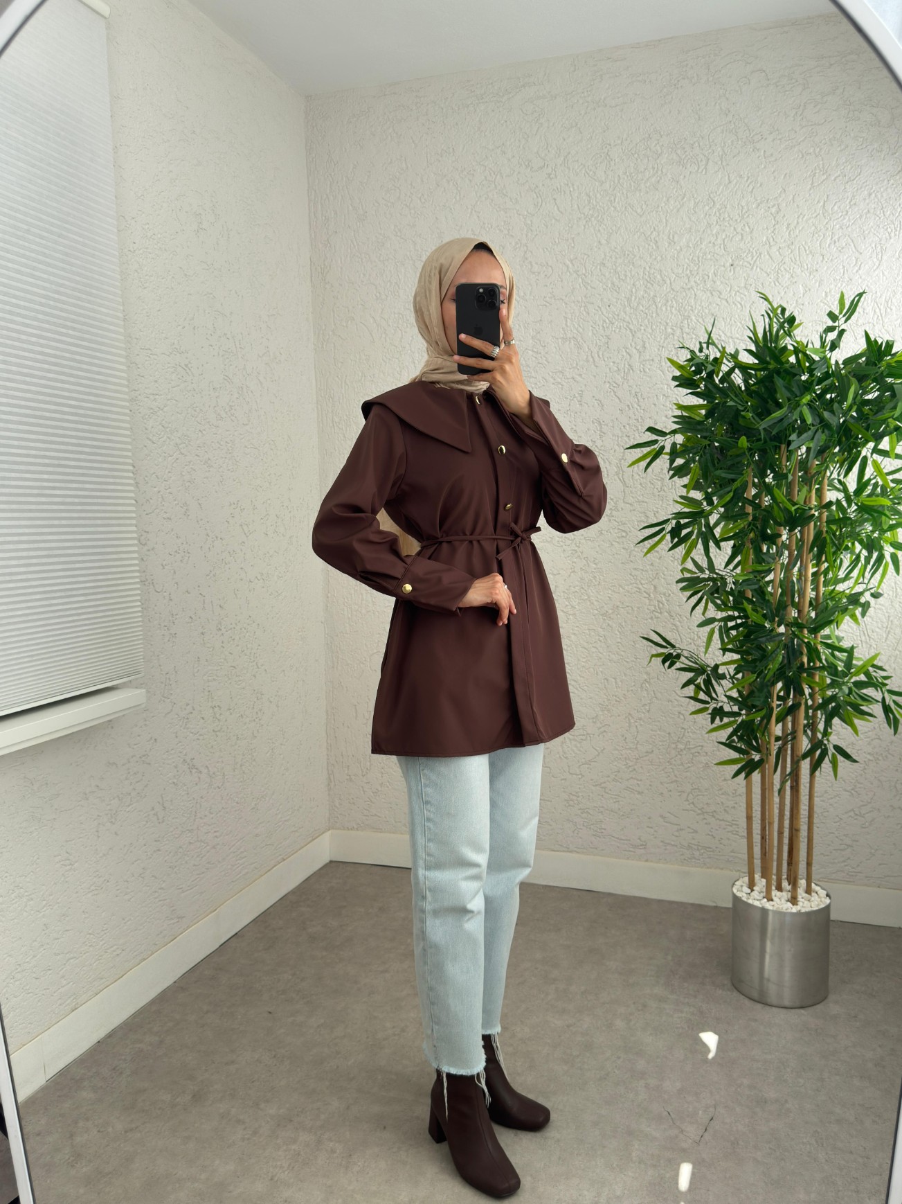 Geniş Yakalı Beli Bağlamalı Bonding Kap -Kahve-Kahve