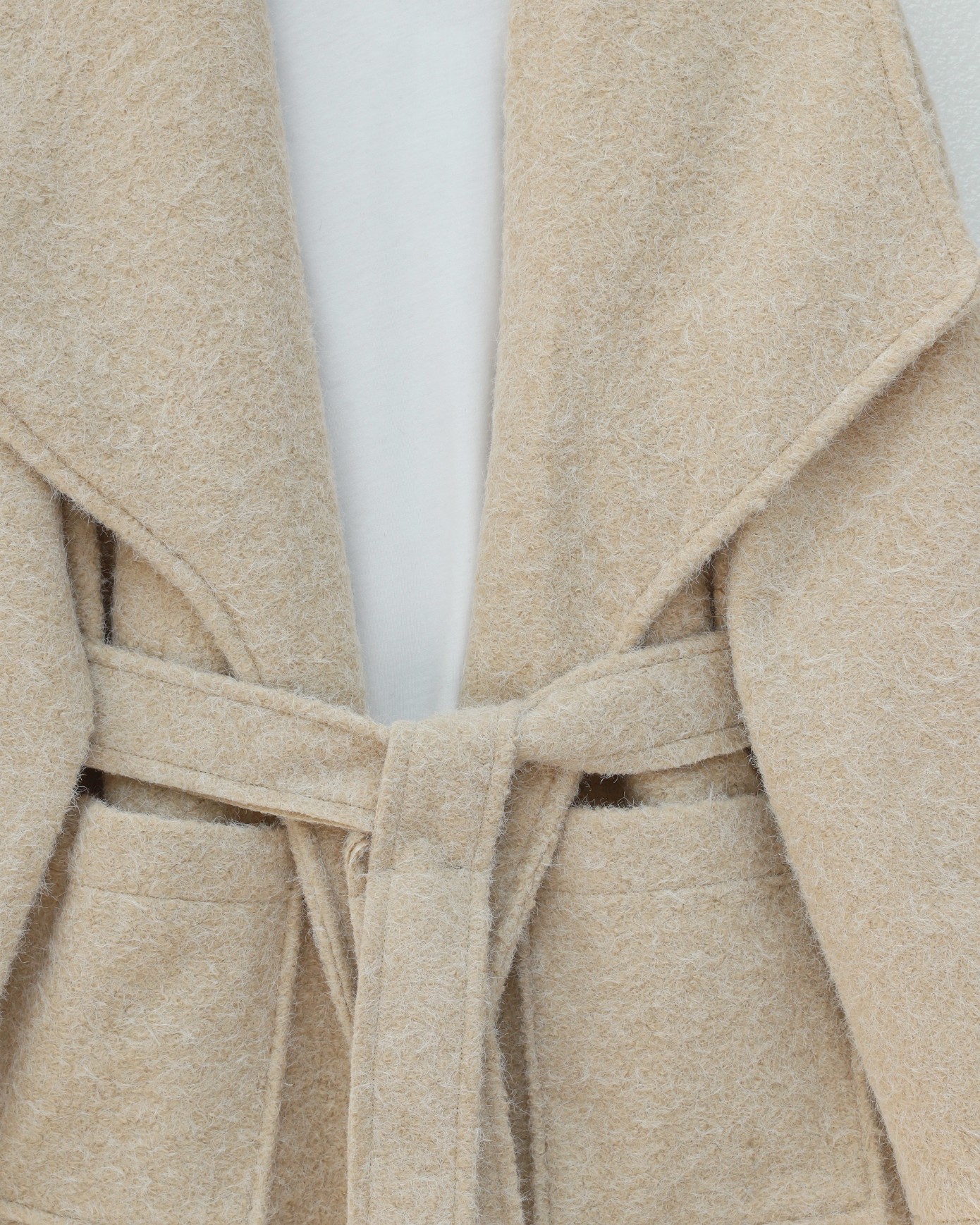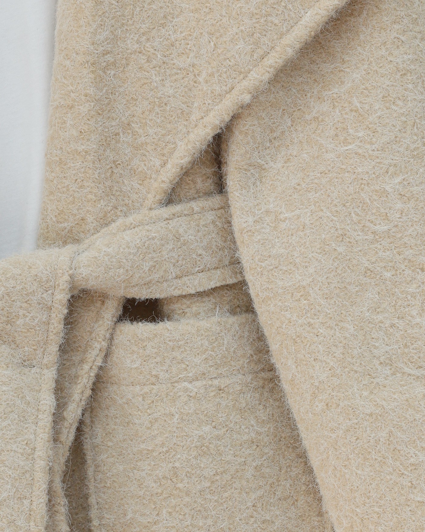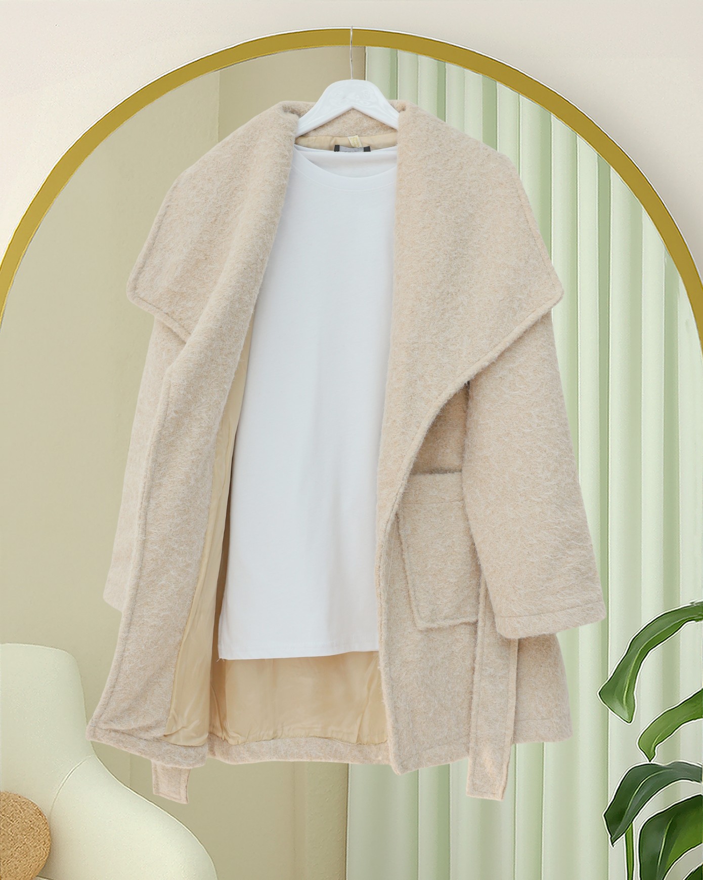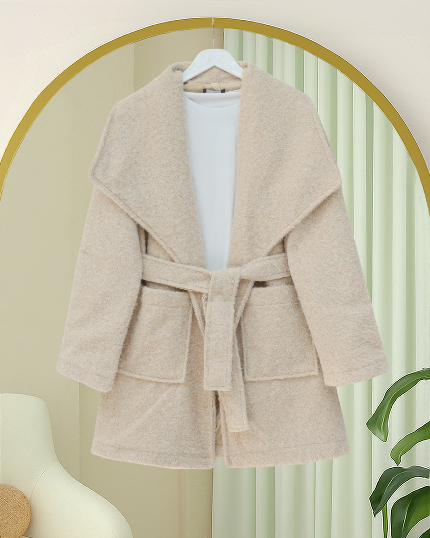 Geniş Yakalı Beli Kemerli Cepli Kaşe Kaban -Bej-Bej