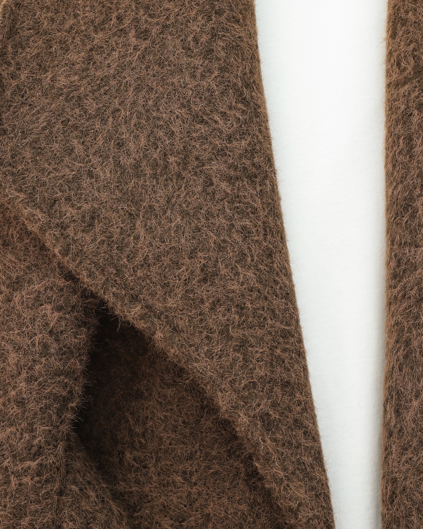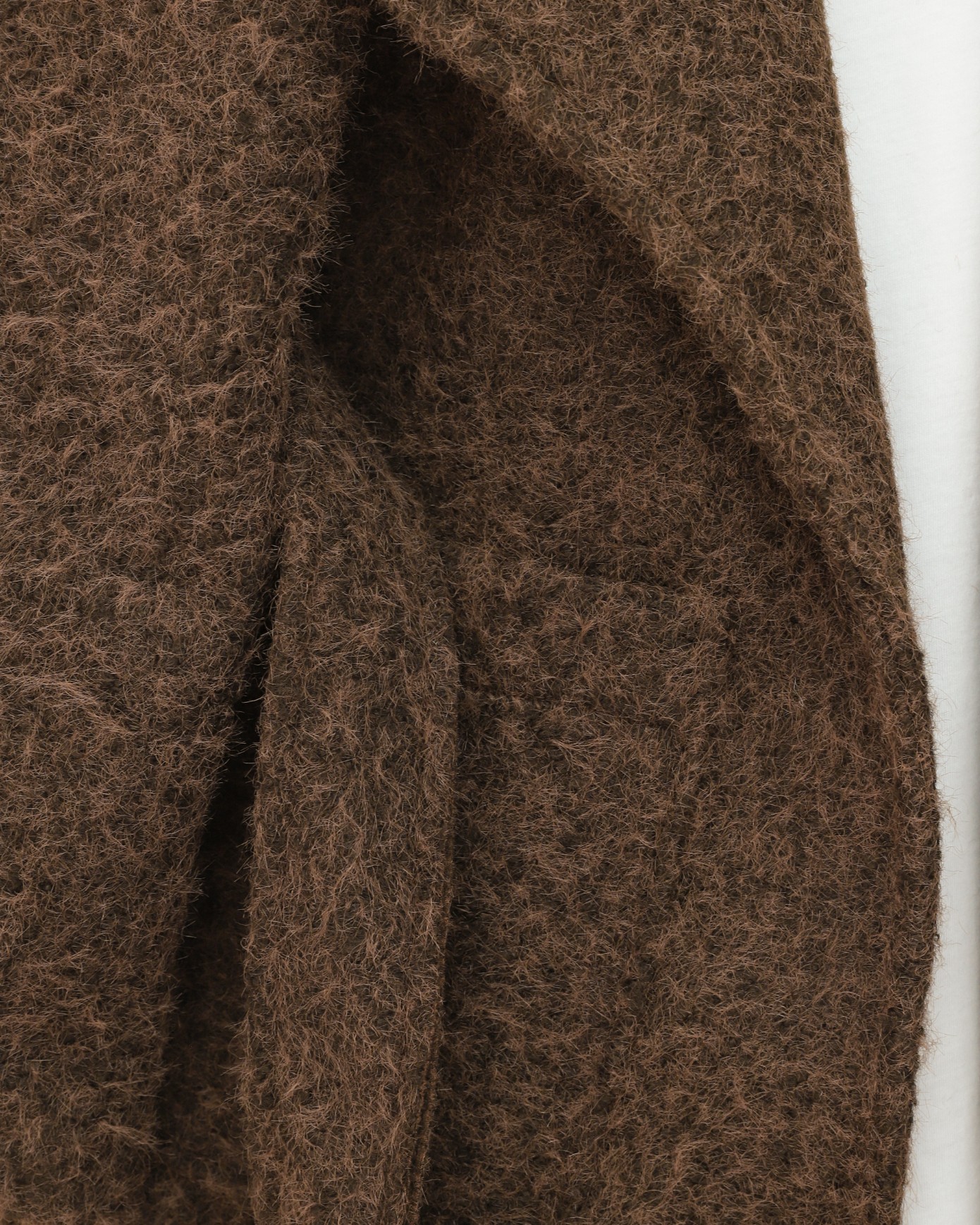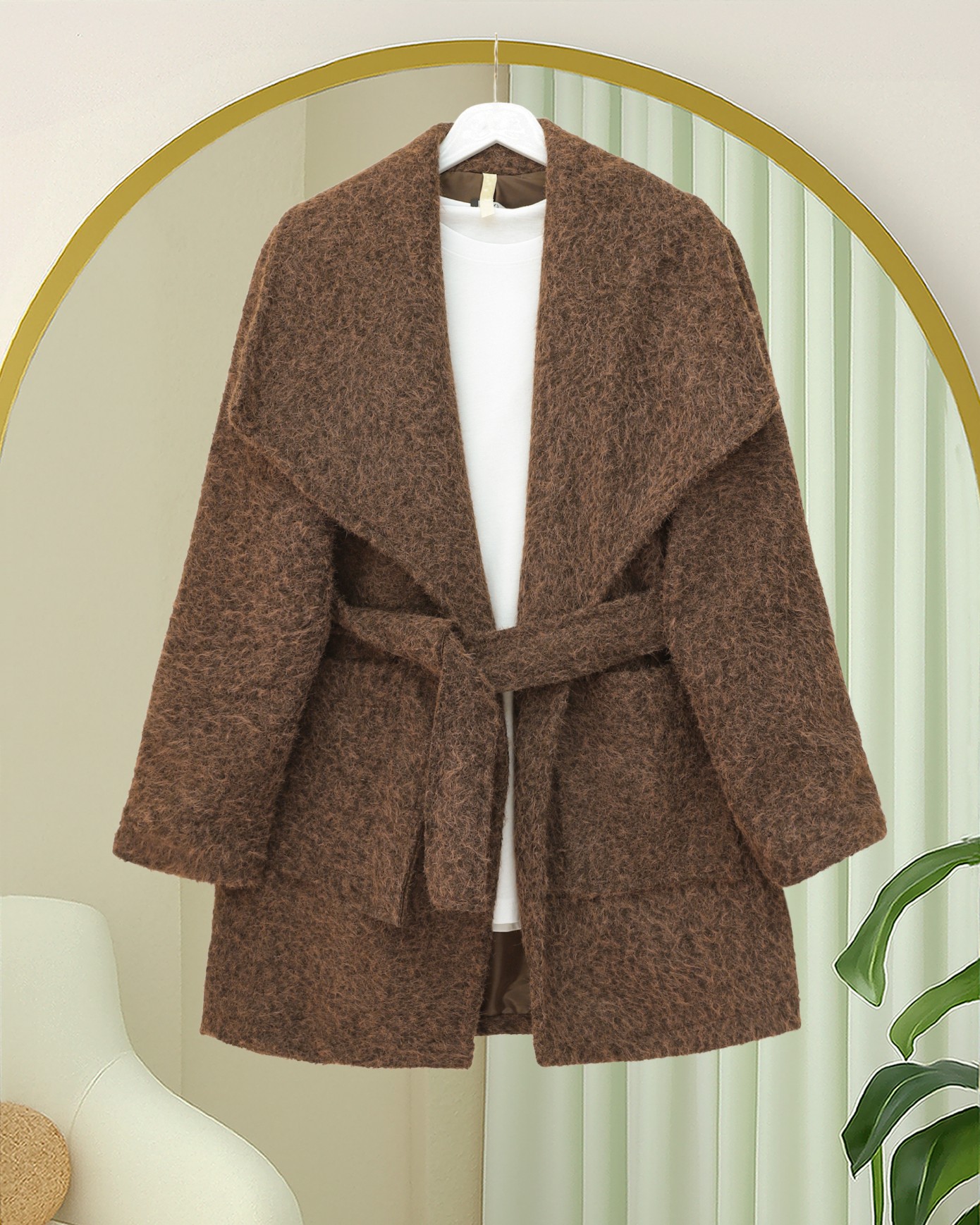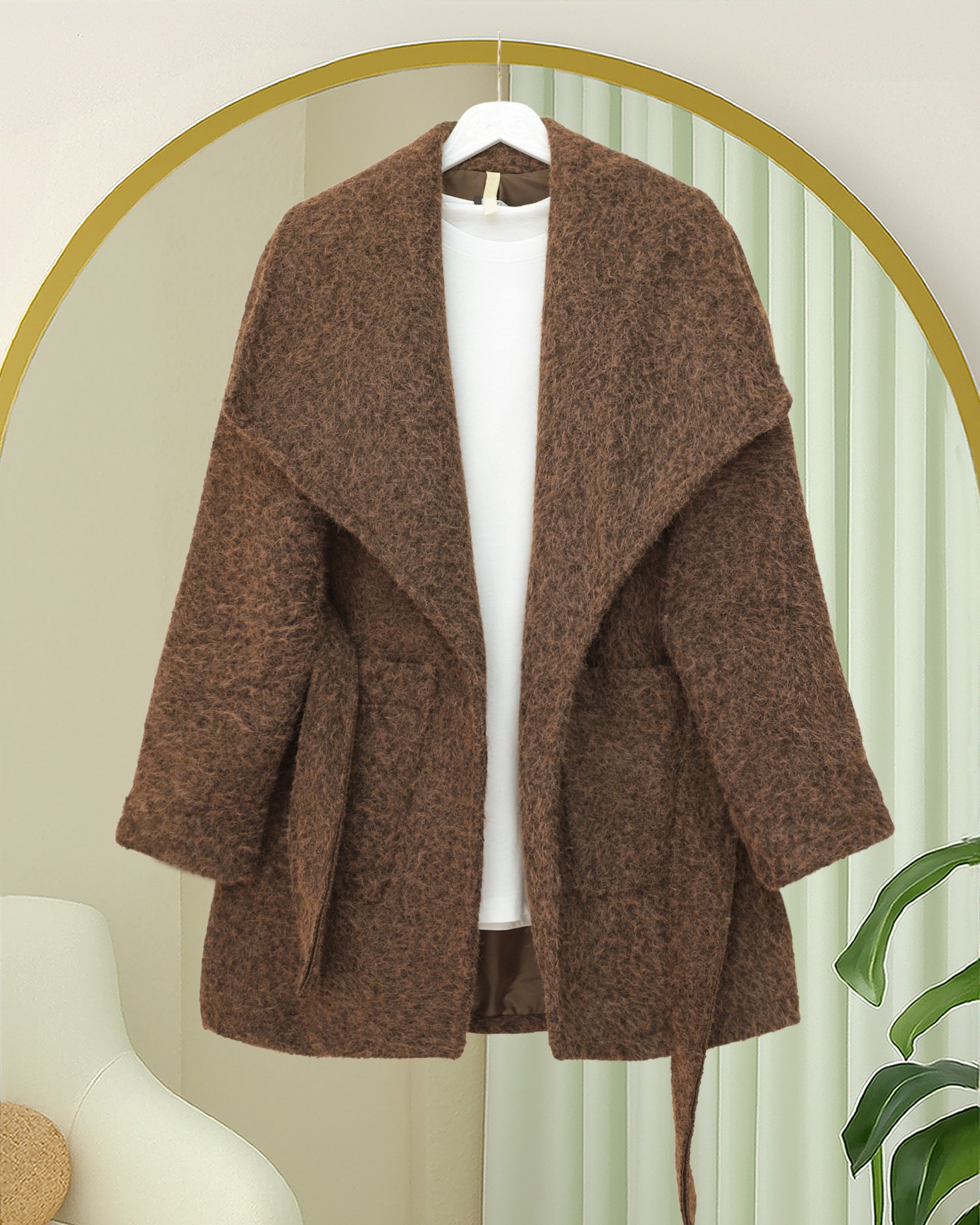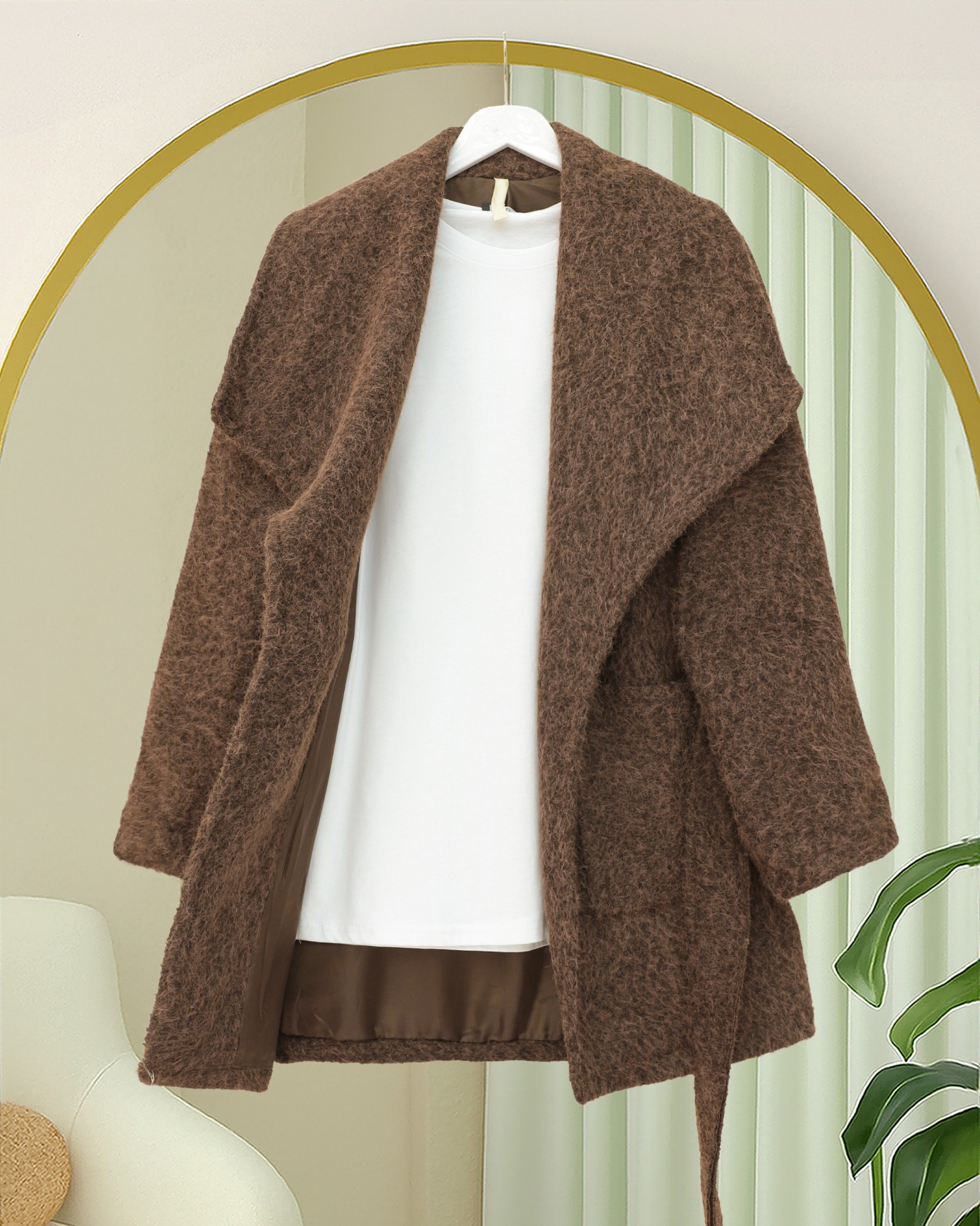 Geniş Yakalı Beli Kemerli Cepli Kaşe Kaban -Kahve-Kahve