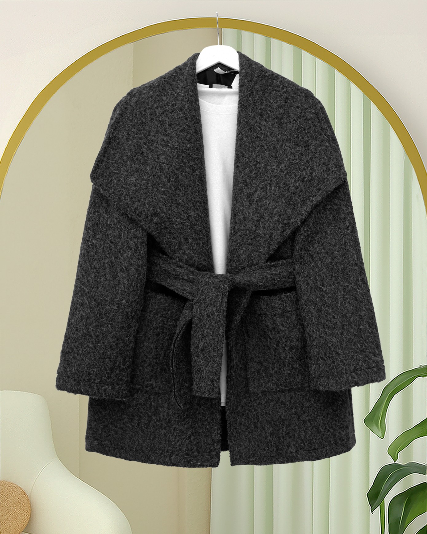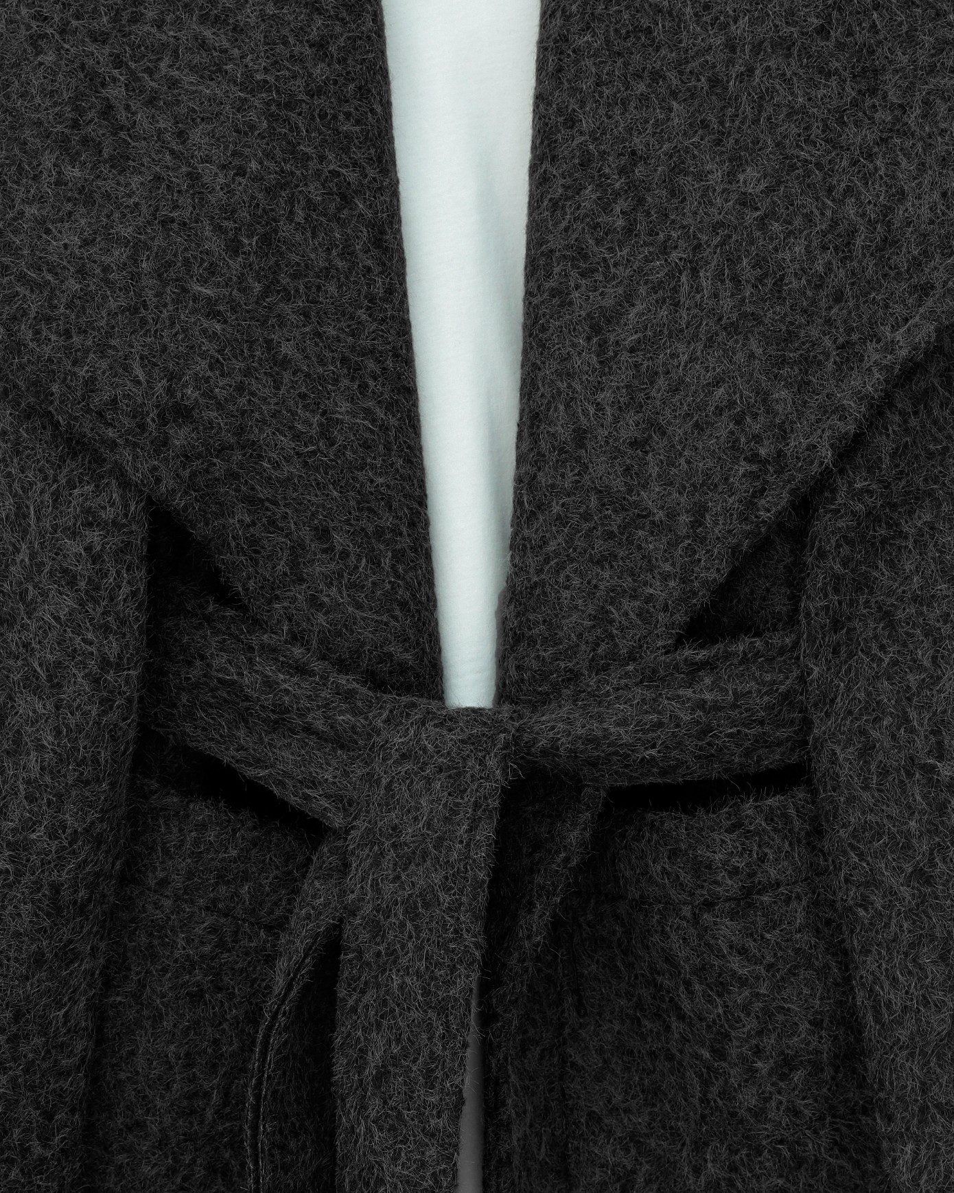 Geniş Yakalı Beli Kemerli Cepli Kaşe Kaban -Siyah-siyah