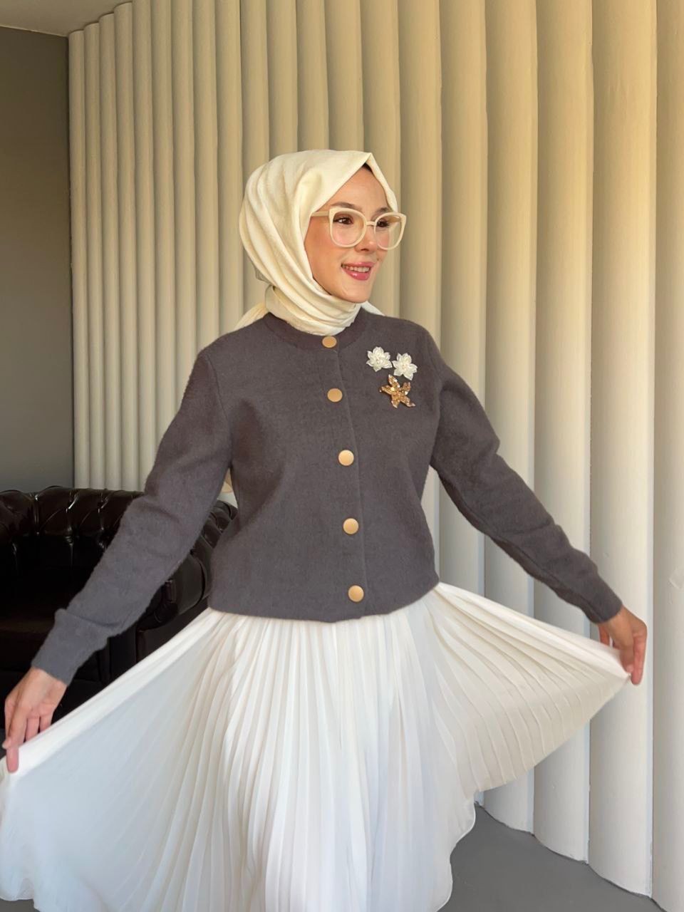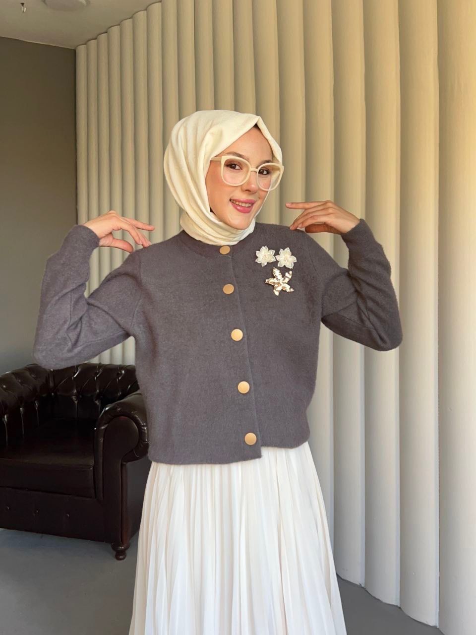 Göğsü Çiçek Desenli Düğmeli Triko Hırka -Füme-Füme