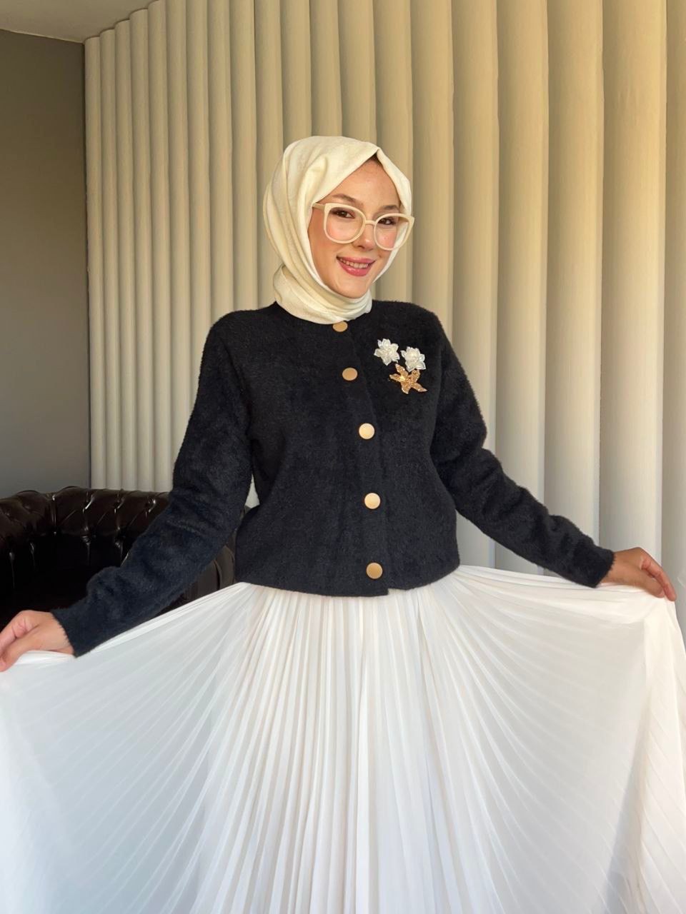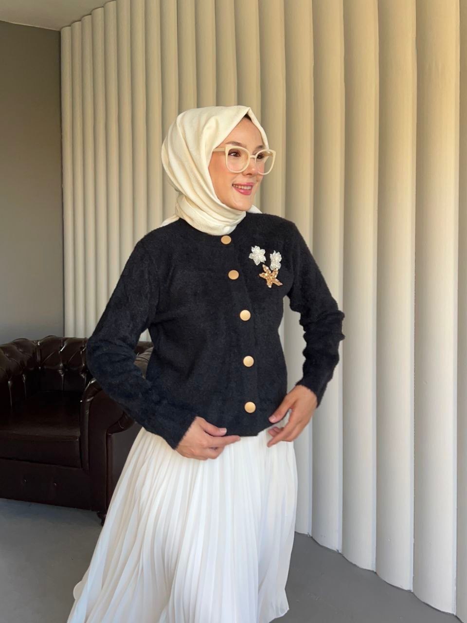 Göğsü Çiçek Desenli Düğmeli Triko Hırka -Siyah-siyah