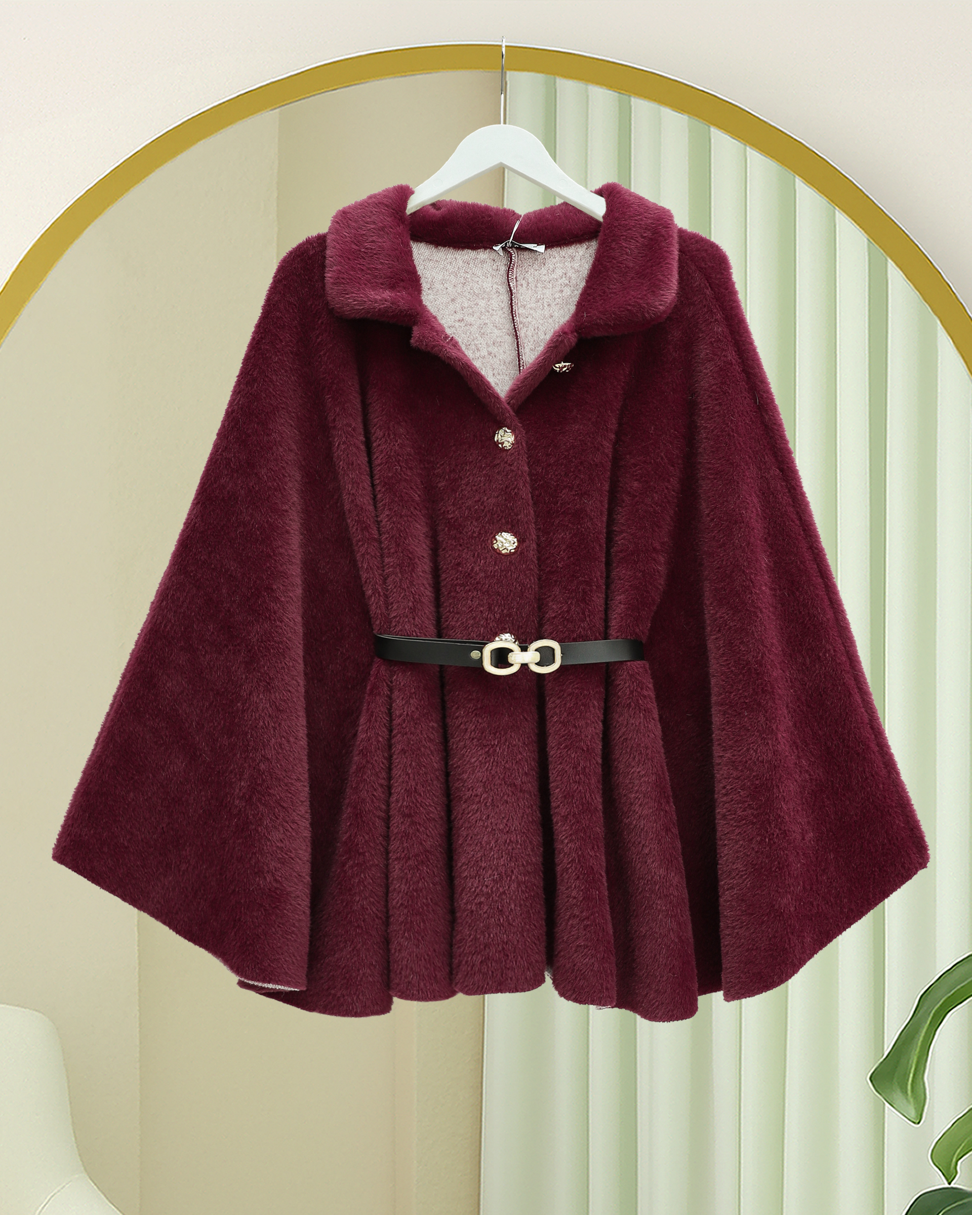 Gold Düğme Detay Kemerli Alcantara Panço -Bordo-Bordo