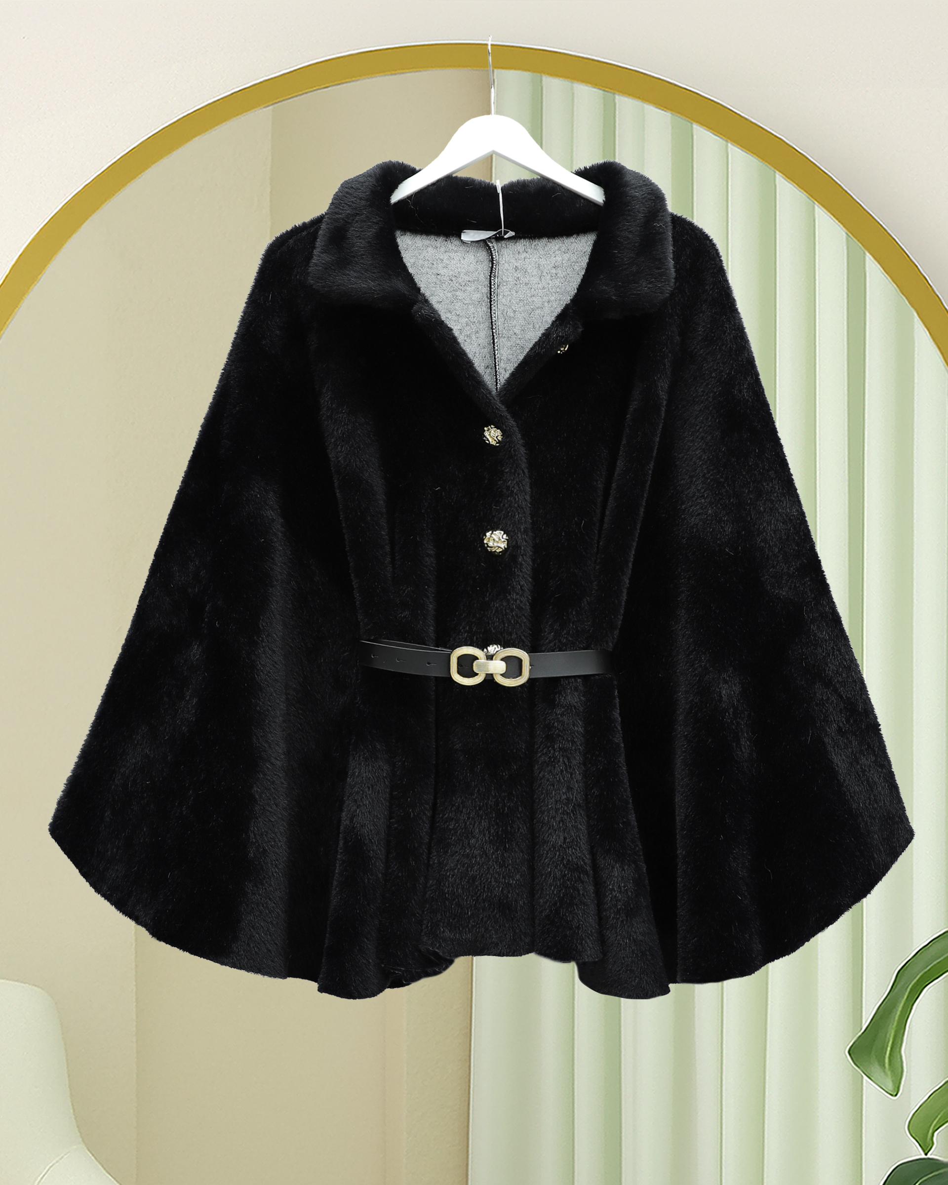 Gold Düğme Detay Kemerli Alcantara Panço -Siyah-siyah