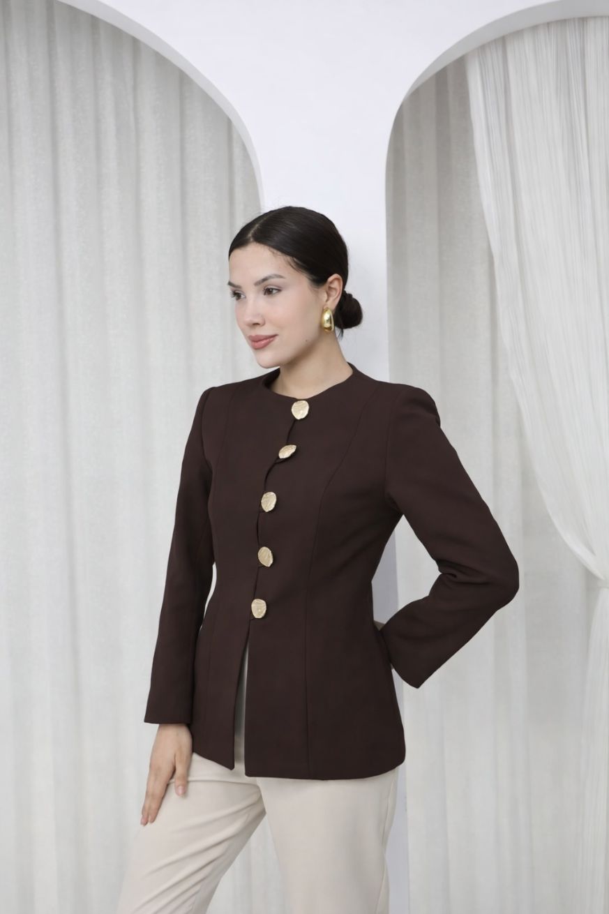 Gold Düğmeli Blazer Ceket Kahve - 1337-Kahve