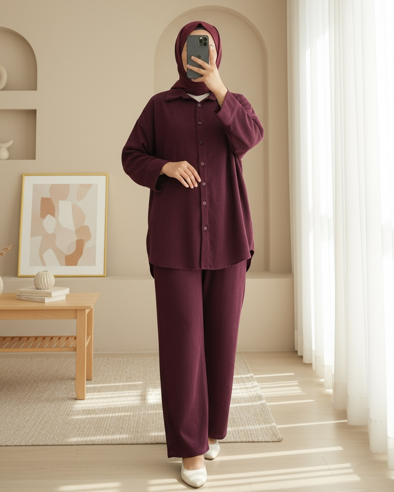 Gömlek Pantolon İkili Kadife Takım -Bordo-Bordo