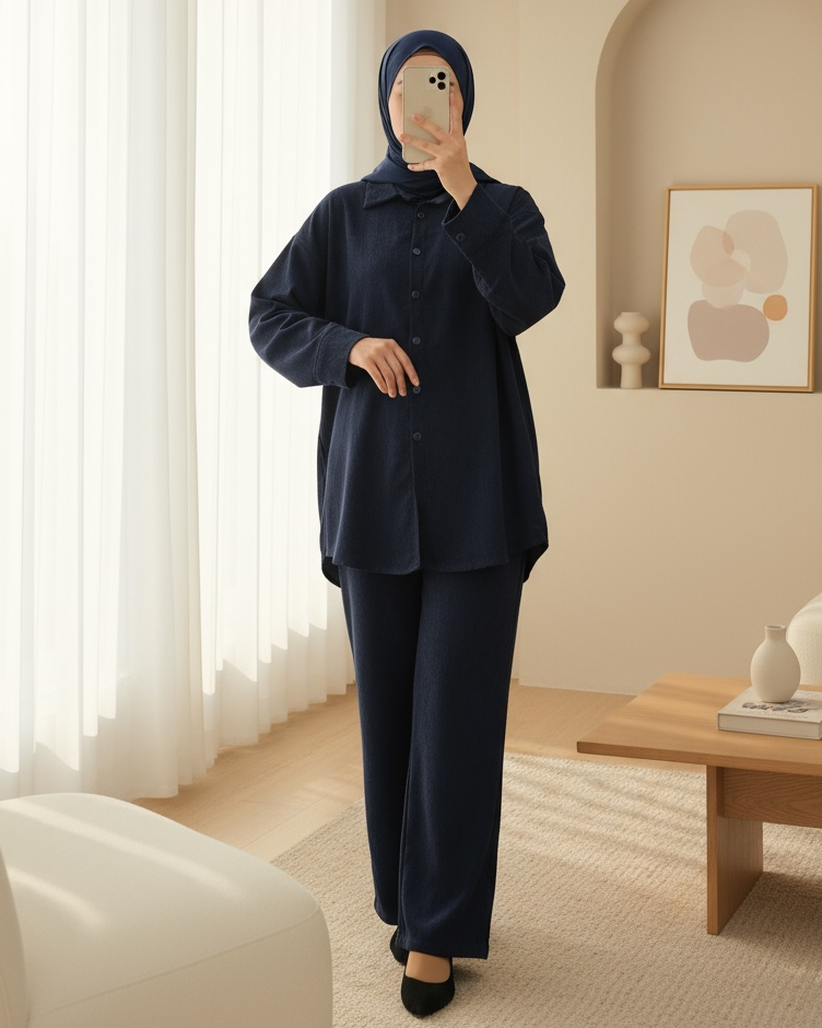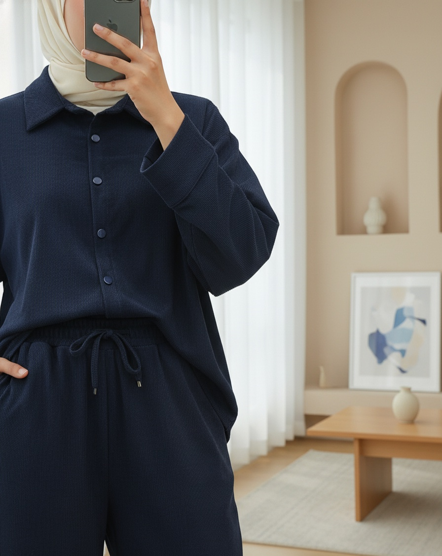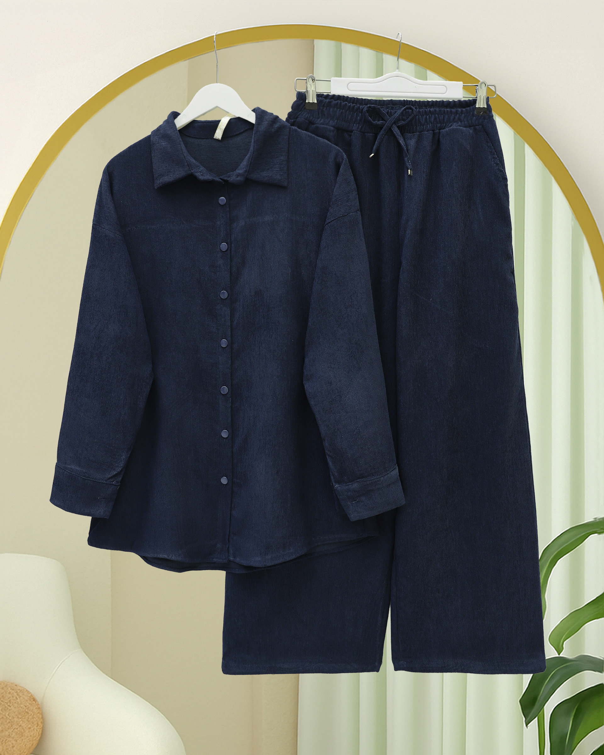 Gömlek Pantolon İkili Kadife Takım -Laci-Lacivert