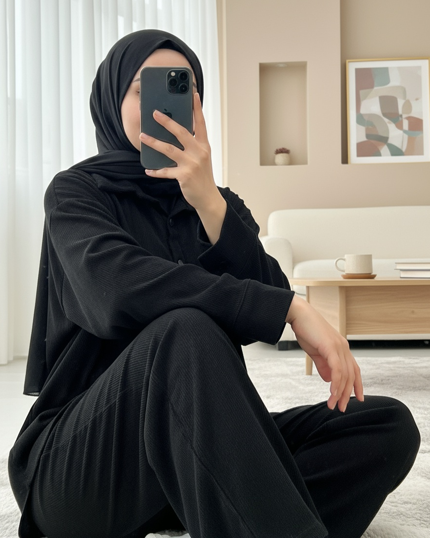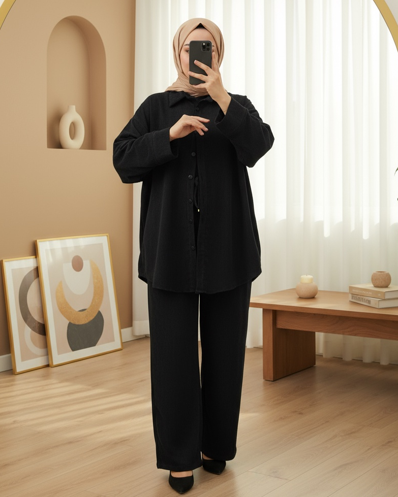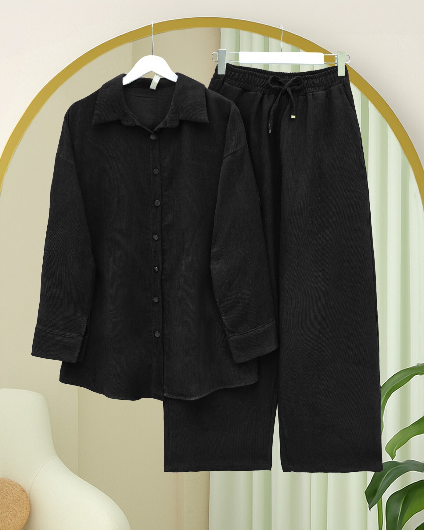 Gömlek Pantolon İkili Kadife Takım -Siyah-siyah