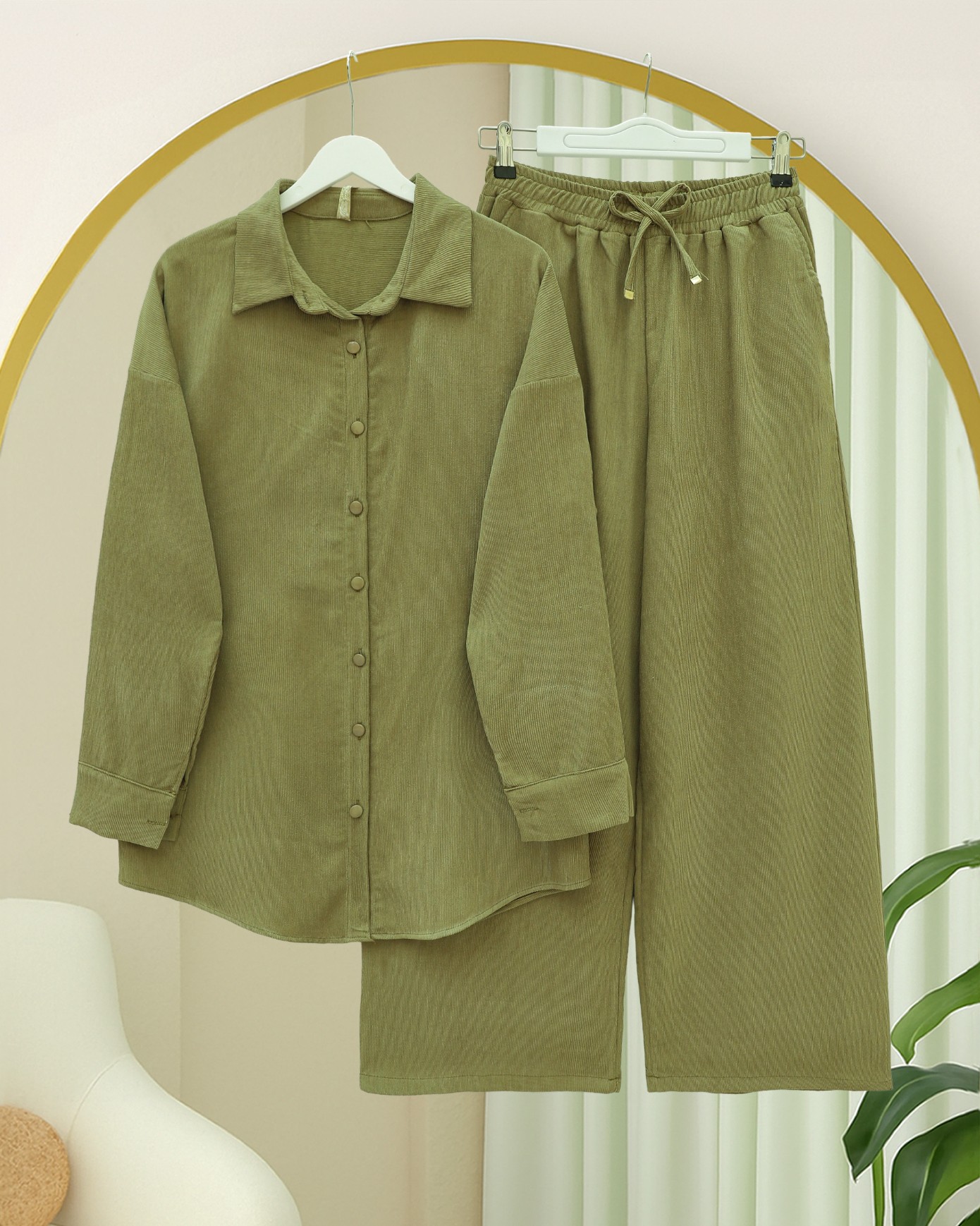 Gömlek Pantolon İkili Kadife Takım -Yağ Yeşili-Yağ Yeşili