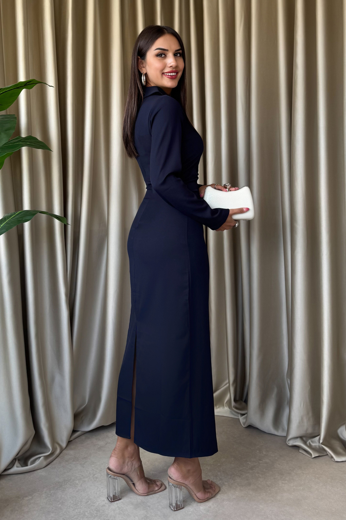 Gömlek Yaka Arkası Yırtmaçlı Uzun Elbise-Lacivert