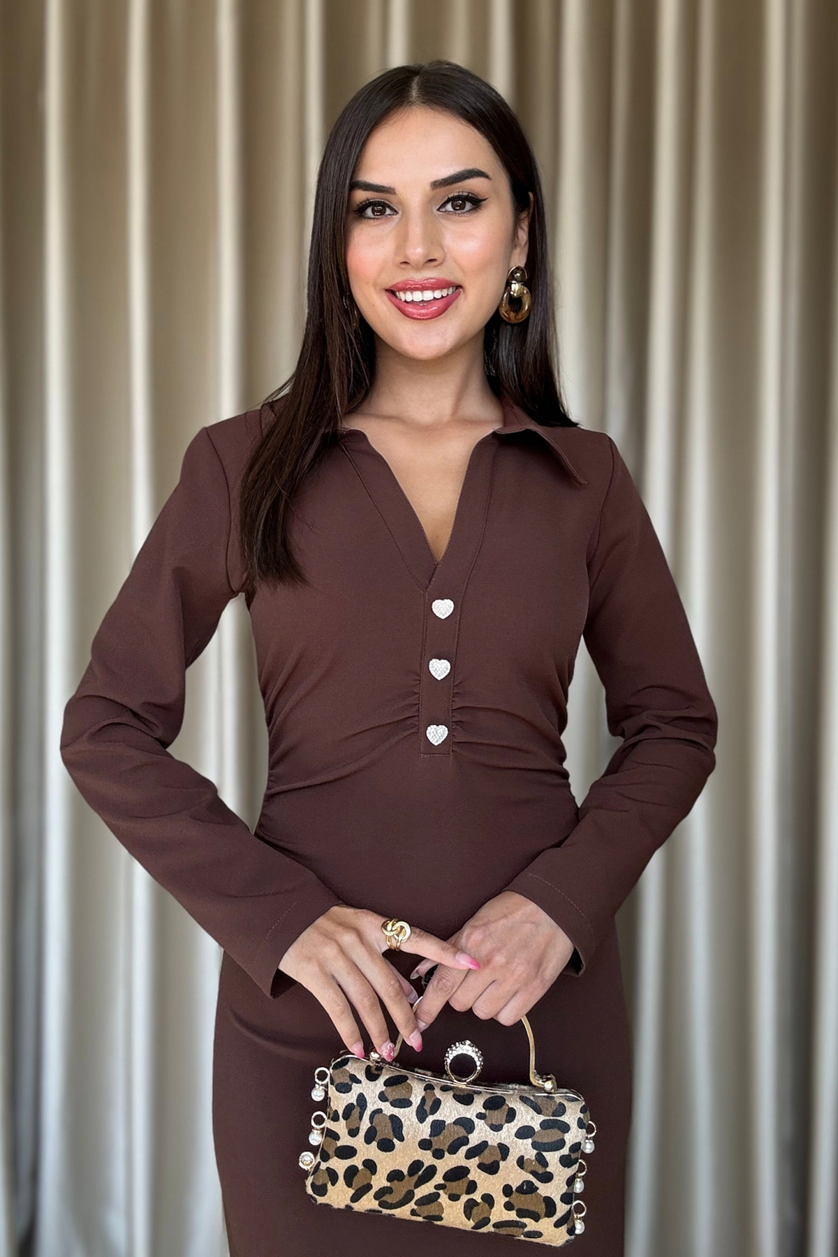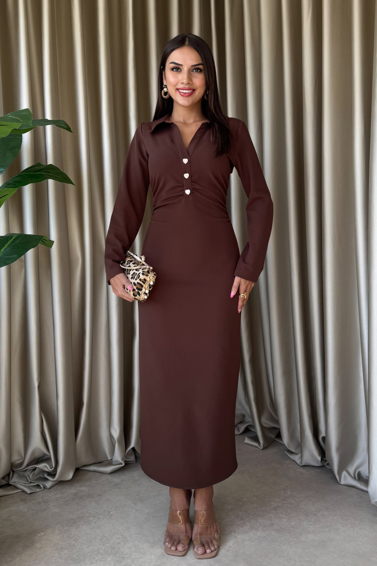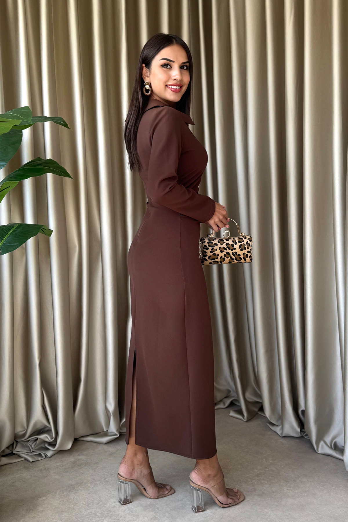 Gömlek Yaka Arkası Yırtmaçlı Uzun Elbise-Kahve