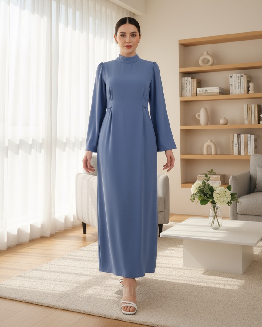 Hakim Yaka Belden Bağlamalı Elbise -Mavi-Mavi